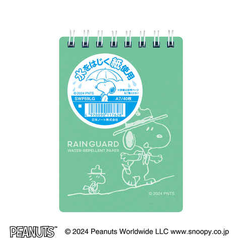スヌーピー レインガードメモ A7 ライトグリーン 40枚 横罫 Wリング 撥水加工 キッチン アウトドア スポーツ 防災 日本ノート 送料無料