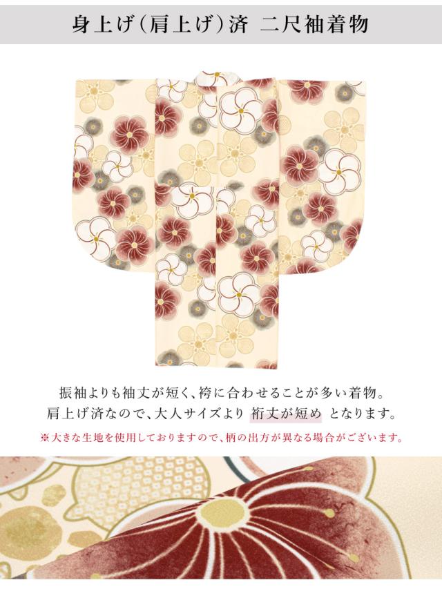 ※着物の柄部分は大きな生地を使用して作られておりますので、色や柄の出方、模様の配置等が画像と異なる場合がございます。