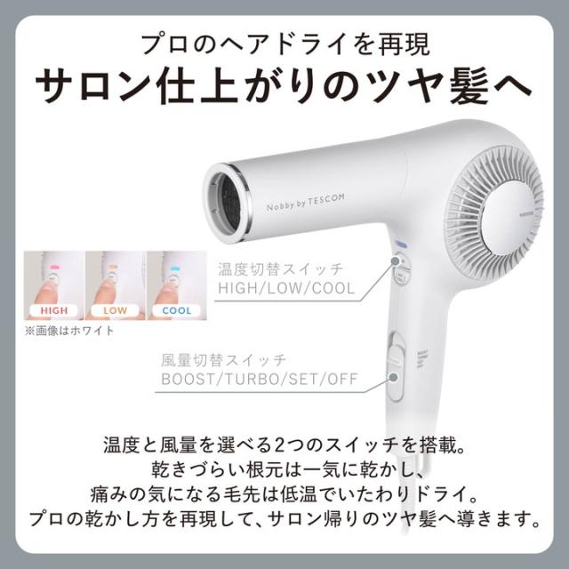 プロ仕様のパワフルな速乾力が、さらにグレードアップ(※1)。業界トップクラスの大風速で、地肌から素早く乾かしサロン仕上がりの美しい髪へ。サロンシェアNo.1ブランド(数量ベース)(※2)『Nobby』の最上位モデルをご自宅で体感できる、プロフェッショナルヘアドライヤーです。 ※1:当社従来品NIB3001との比較。 ※2:2024年4月〜2025年3月の国内美容院(サロン)への業務利用ドライヤー販売荷数(サロンでの販売分除く)(東京商工リサーチ調べ)![]() ■サロンシェアNo.1(数量ベース)(※)ブランド『Nobby』から生まれたNobby by TESCOM。洗練されたデザインとともに、「私にできる、サロンクオリティ」をコンセプトにプロの技をご自宅でリアルに再現できる機能を搭載しました。 ■※2024年4月〜2025年3月の国内美容院(サロン)への業務利用ドライヤー販売荷数(サロンでの販売分除く)(東京商工リサーチ調べ) ■プロ用に独自開発した「シロッコファン」で大風圧・大風速を実現。78枚の羽根それぞれが曲面を持ち、空気をすくって力強く押し出す独自設計に。髪の根元を持ち上げ地肌からしっかりと乾かし、仕上がりに差がつきます。 ■プロテクトイオン搭載で、髪のツヤをアップ。マイナスイオンとプラスイオンを同時に放出することで、それぞれのイオンが髪に働いて、髪の広がりや傷みの一因となる静電気を抑制します。 ※放出イオン量:約1,000万個/cm3以上。当社測定法/当社比較法による ■軽量・高耐久・長寿命にグレードアップ。プロ用ブラシレスDCモーター搭載により、パワフルで安定した風を送り続けられます。 ■従来のDCモーターより小型化されたブラシレスDCモーター搭載で、スリム&軽量化。従来機種と比べ製品の奥行が14mmスリムに、さらに180g軽くなりました。操作がしやすく、疲れにくいため快適にヘアドライができます。 ※当社従来品NIB3001との比較。 ■温度と風量を選べる2つのスイッチを搭載。乾きづらい根元は一気に乾かし、痛みの気になる毛先は低温でいたわりドライ。プロの乾かし方を再現して、サロン帰りのツヤ髪へ導きます。 ■温風冷風の自動切り替えと独自の風速で、美しい仕上がりに。髪のまとまりと速乾のバランスに優れた風速で、温風と冷風を一定間隔で自動的に切り替えるモードを搭載。温風と冷風を交互に当て、最適な風速で乾かすことで、髪のツヤ10%アップ。 ■※TURBO-HIGHとの比較。当社測定法/当社比較法による。ご使用方法や髪質によって個人差があります。 ■付属のセットフードは、フードとブラシで髪を挟み込みやすい形状に。プロの仕上げのような、安定したブローを自分で行えます。 ■※使用中・使用後は高温のためさわらないでください。 ■※樹脂製のブロー用ブラシを使用してください。耐熱温度110℃以上のブラシを推奨。獣毛や木製・金属製のブラシは使用できません。 ■※フードをブラシに強く押しあてるとピンが変形する恐れがあります。 ■付属のスタンドを使って両手で乾かすことができます。ロングヘアでも疲れず快適に乾かせます。使った後は立てて収納でき、スペースを取りません。 ■従来のフィルターに比べ、耐久性の高い高性能フィルターを採用。お手入れがしやすく水洗いも簡単に行えます。 ■使いやすいラク抜きプラグ。力の弱い方やお年寄り、爪の長い方やネイルをしている方でも、レバーを押すだけで簡単にプラグを抜くことができます。 ![]() ■電源:AC100V 50/60Hz ■消費電力:1300W ■温風温度:120℃(周囲温度30℃の場合、BOOST-HIGH時) ■コンセントタイプ:風量切替スイッチ BOOST/TURBO/SET/OFF、温度切替スイッチ HIGH/LOW/COOL、温冷自動切替スイッチ ON/OFF ■外形寸法:幅約245mm×奥行約81mm×高さ約226mm(本体のみ)、幅約299mm×奥行約81mm×高さ約226mm(セットフード付き) ■質量:620g(本体のみ)、650g(セットフード付き) ■カラー:ホワイトアッシュ ■コード長:1.7m ■安全装置:温度過昇防止装置(サーモスタット・温度ヒューズ) ■海外使用:× ■付属品:セットフード、スタンド ■パーツ:セットフード(TA033659)、高性能フィルター(TA033628)、スタンド(TA033901)、フィルターカバー(TA033680) ■保証期間:2年間 ■主材料:PC |