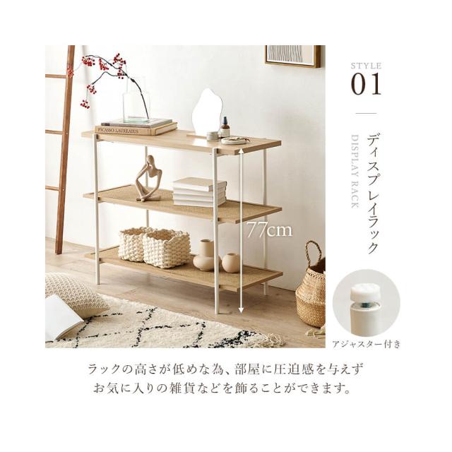 ラックの高さが低めな為、部屋に圧迫感を与えず雑貨などを飾ることができます。