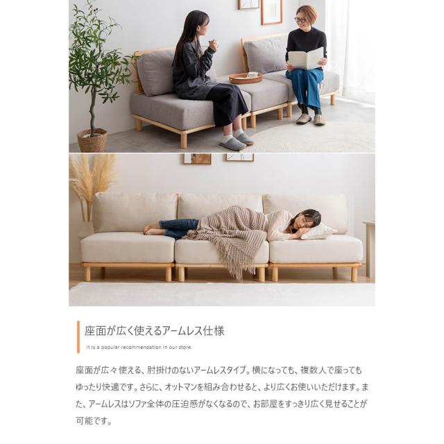 アームレスのデザインにより、ソファ全体の圧迫感が軽減され、お部屋をすっきり広く見せることが可能です。