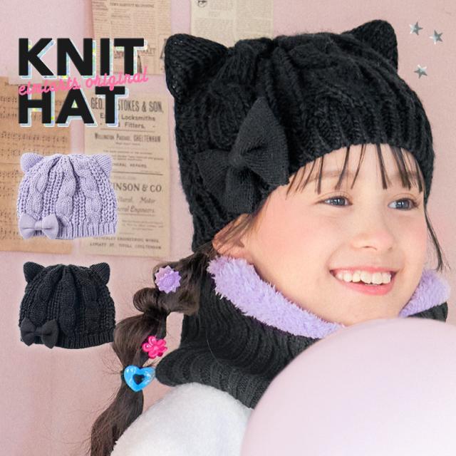 ニット帽 キッズ 女の子 猫耳 猫 ねこ ワンポイント カジュアル 定番 帽子 子供 子ども ジュニア 防寒 ケーブルニット リボン
