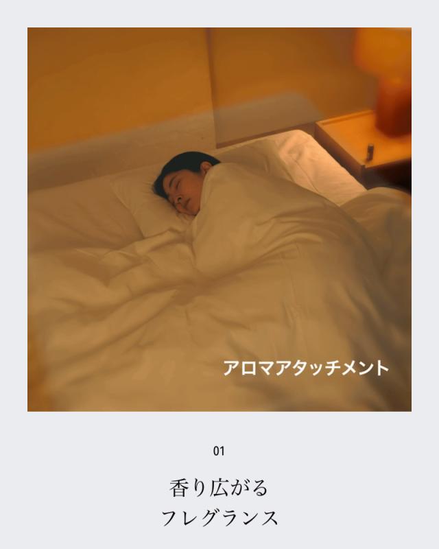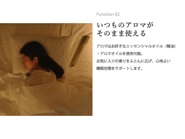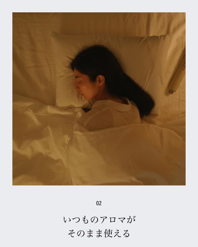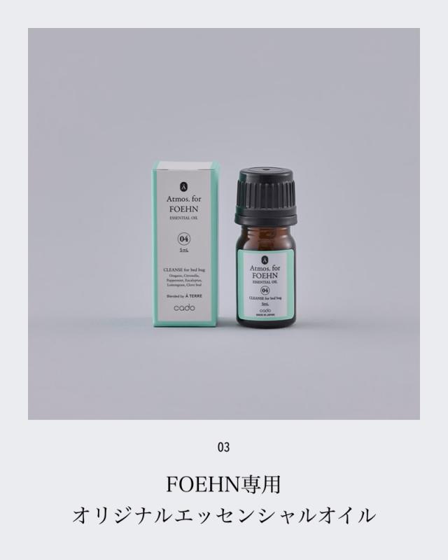 お好みの市販のアロマで楽しめるほか、安眠効果とベッドバグ対策を両立した専用のエッセンシャルオイル(Atmos. for FOEHN/FAT-CL04)も用意しています。