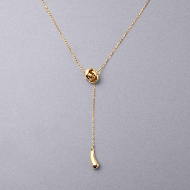 ドロップとツイストノットのY字ロングネックレス。華奢なチェーンとの組み合わせがモチーフを引き立たせ、コーデに程よいアクセントを添えるひと品◎スライド式アジャスターでお好みのバランスに調節ができます。モチーフを後ろ側にしてもお使いいただけるアレンジ自在なデザインも魅力◎