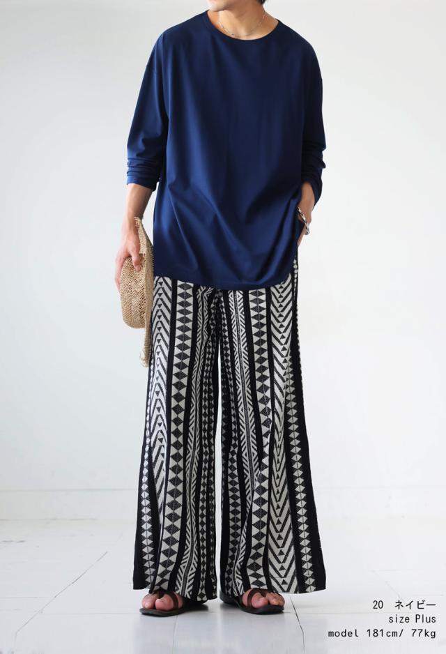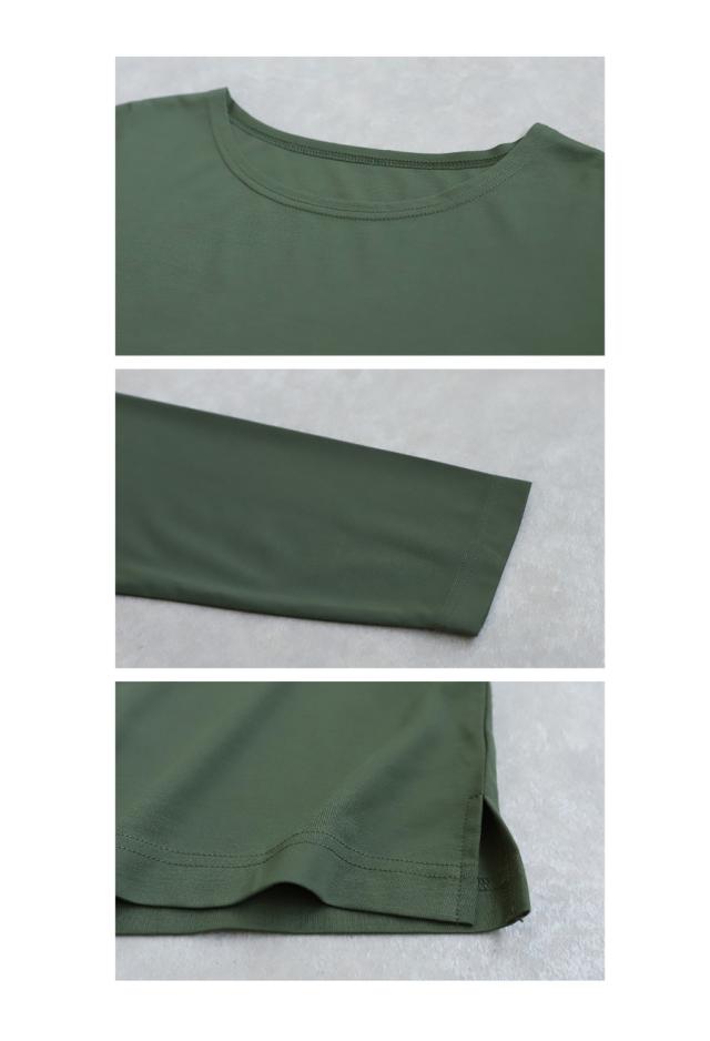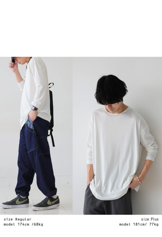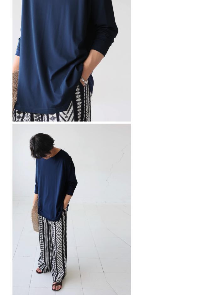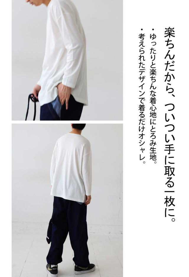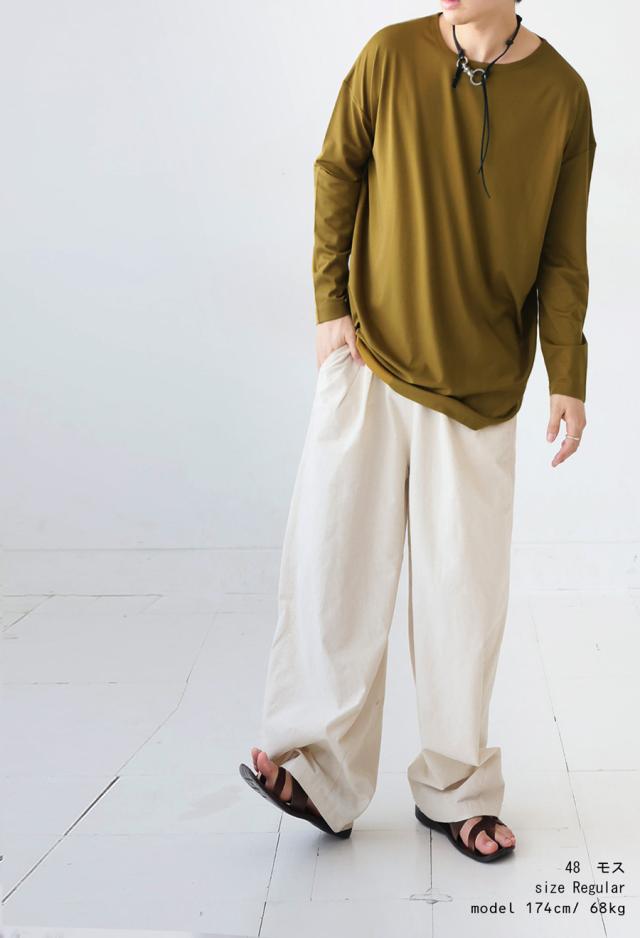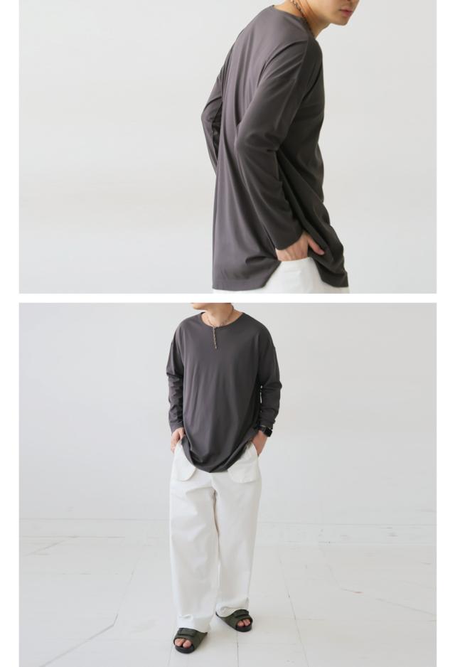 ネックラインはゆるやかなクルーネック仕様で、窮屈感なくリラックスした雰囲気に。