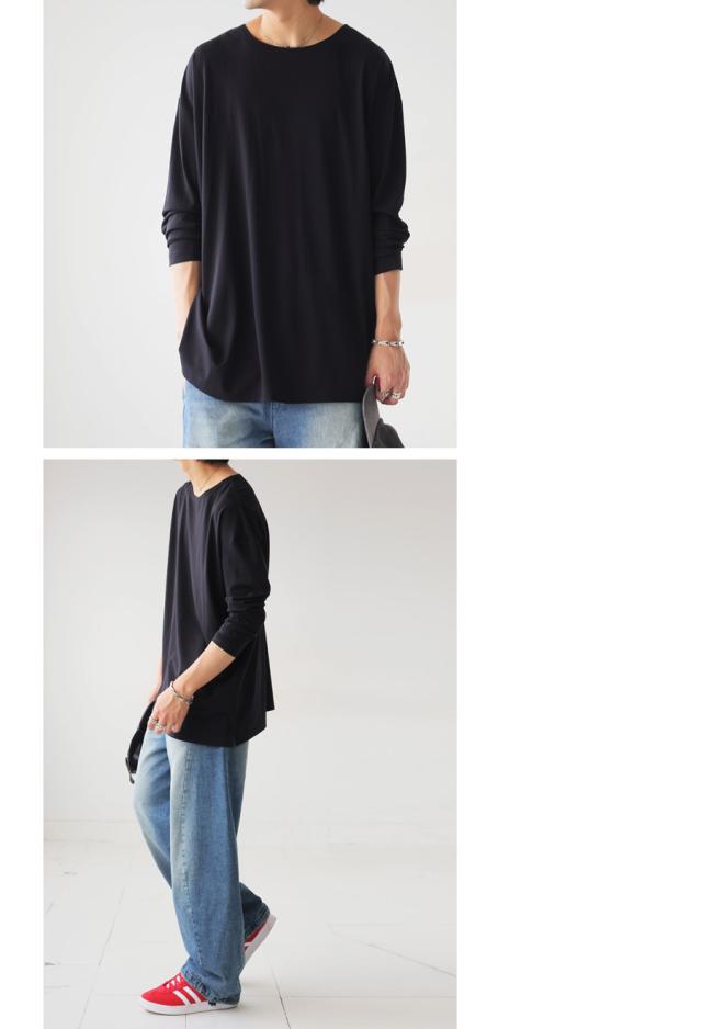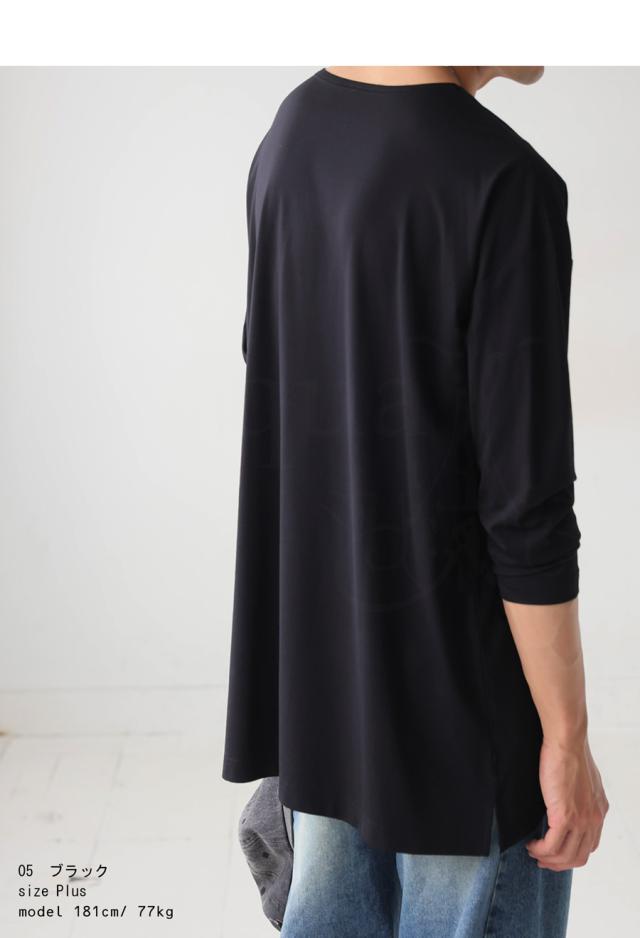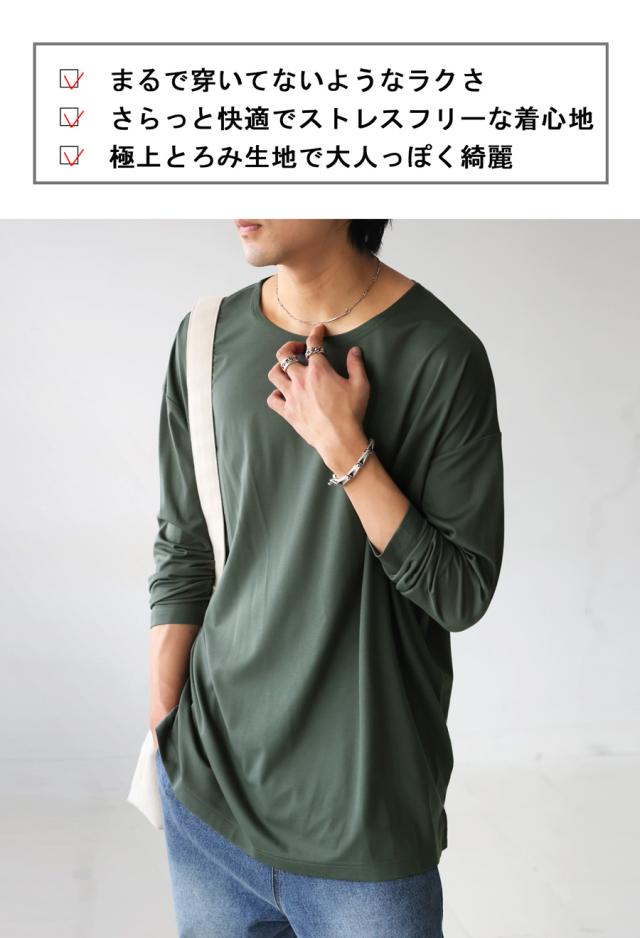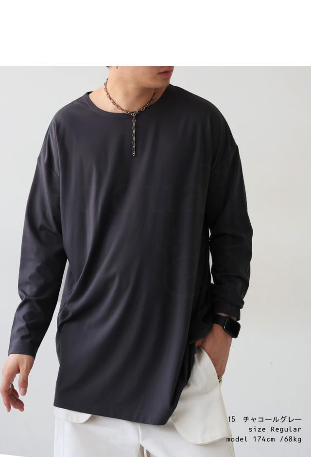シンプルで洗練された印象を与える、とろみ素材のメンズロングTシャツ。