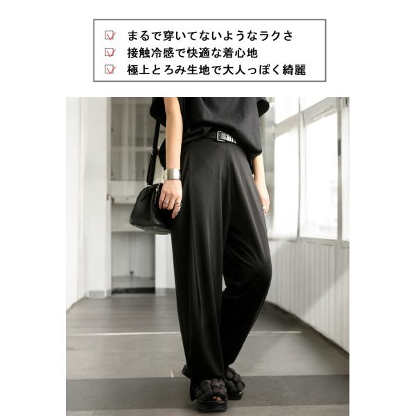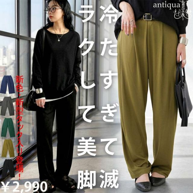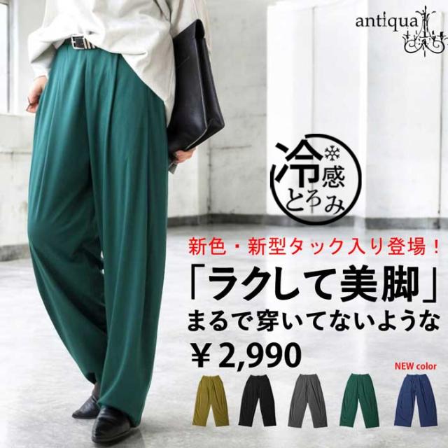 ay-00068 無地 機能性生地 前フラット 後ろゴム タック ウエストゴム サイズ調節可 美脚 脚長 デイリー 着回し 体型カバー 滑らか とろみ素材 ワイド テーパード ポケット付き