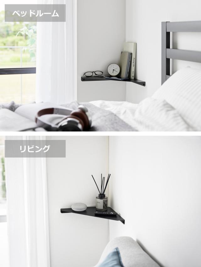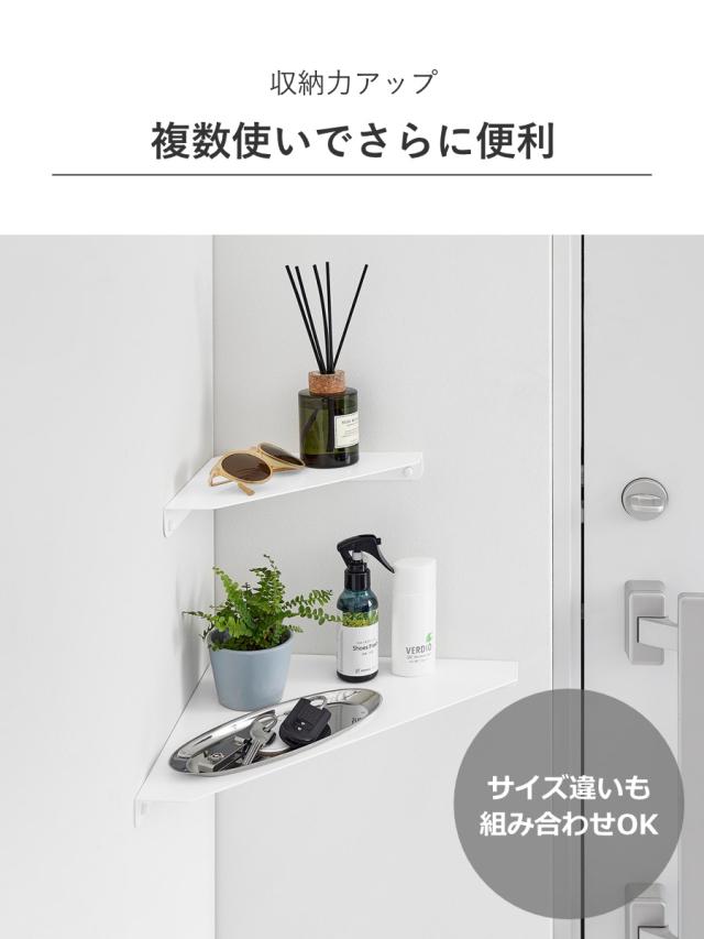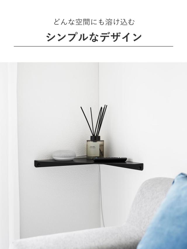 デッドスペースになりやすいお部屋のコーナーに壁付けするだけで、ちょっとした小物を置いたり、ディスプレイスペースを手軽にプラスできる便利なワイドコーナーシェルフです。