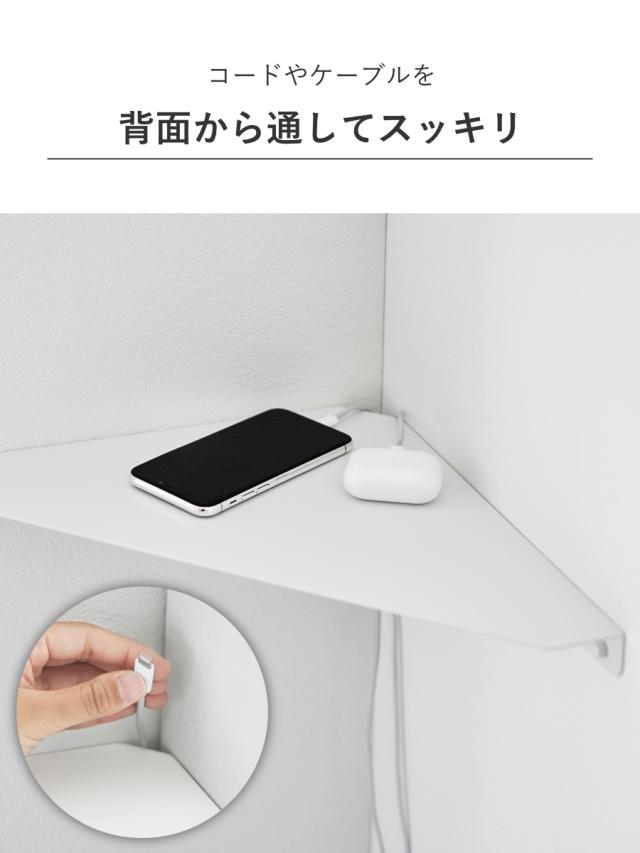 シェルフ奥には隙間があるので、電源コードや充電ケーブルなどを通せます。スマホやイヤホンなど充電しながら置けて便利です。配線が奥にあることで見た目もスッキリします。