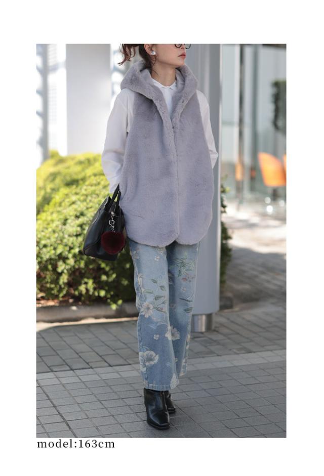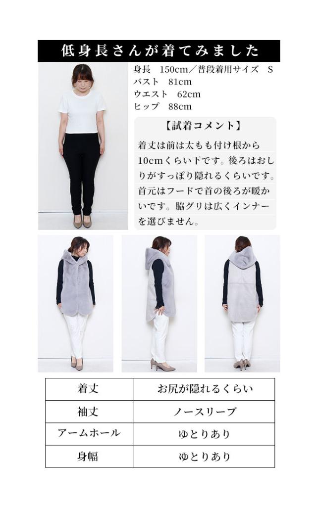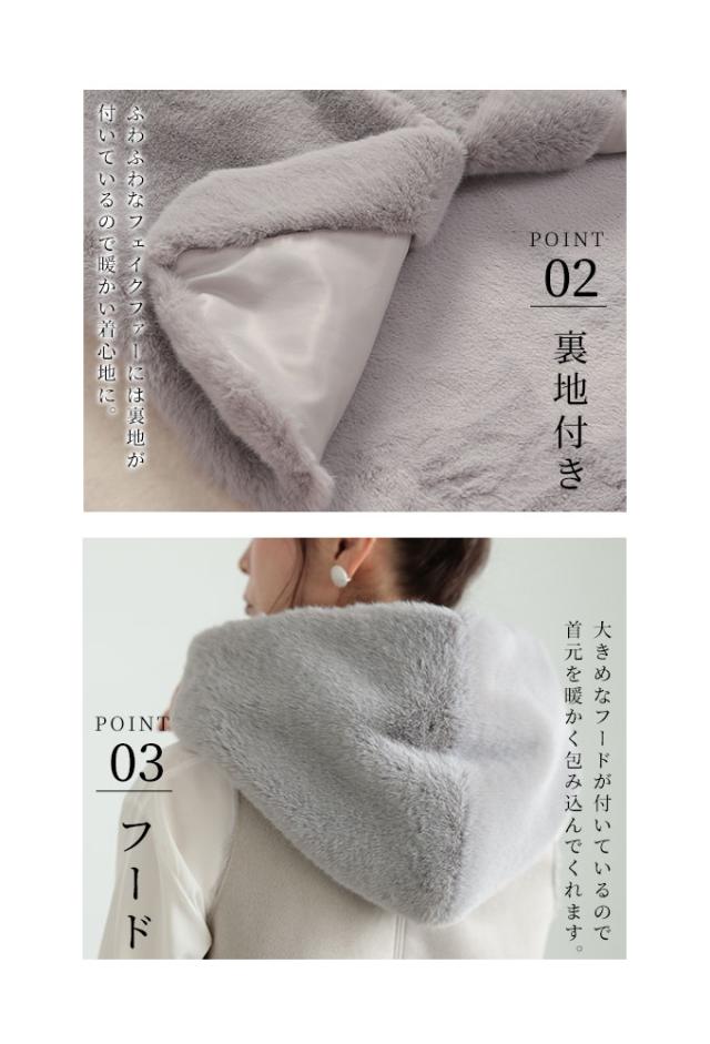 着丈は前は太もも付け根から10cmくらい下です。後ろはおしりがすっぽり隠れるくらいです。首元はフードで首の後ろが暖かいです。脇グリは広くインナーを選びません。身幅も余裕があり楽に着用出来ました。前とフードはファーになっているのでとても暖かいです。フックで止めるのでサッと羽織れるのも良いですね。後ろはスウェードのような生地なので着膨れせずに着用出来ました。軽くてとても肌触りの良いファーで着心地抜群でした。