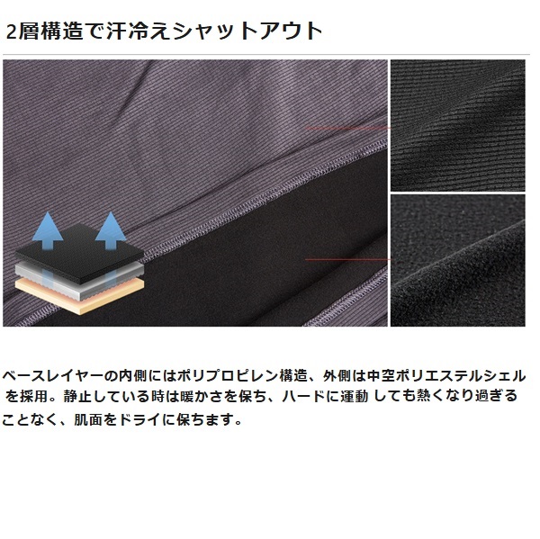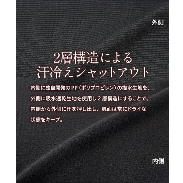 起毛させた撥水生地と吸水速乾生地の2層構造で汗冷えをシャットアウト。軽量&動きを妨げないゆったりタイプで、これ1枚でも快適にお過ごしいただけます。