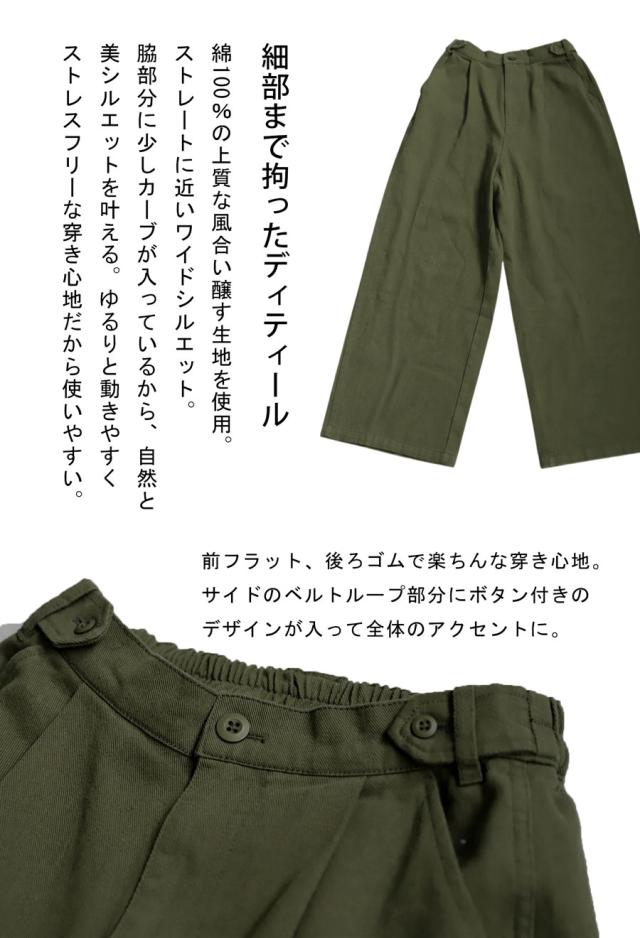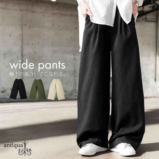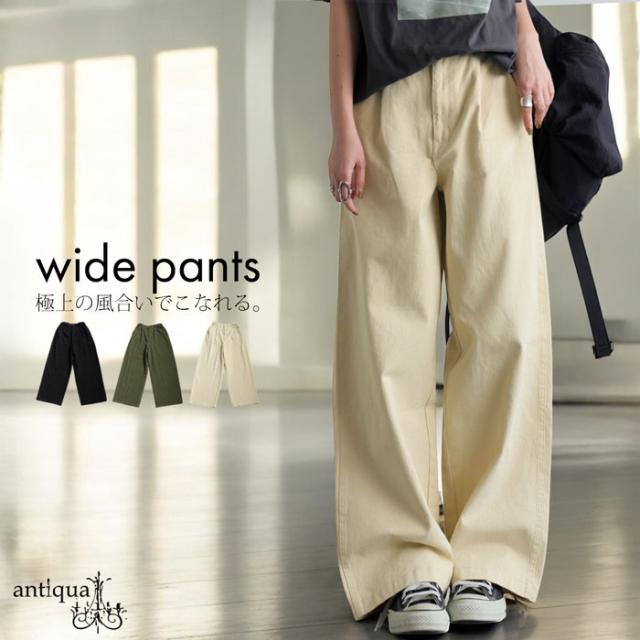 【検索ワード】コットンワイドパンツ パンツ レディース ボトムス ロング 無地 綿100 綿 コットン ゆったり ワイド ワイドパンツ ワイドストレート タック ウエストタック 美シルエット 落ち感 シンプル 上品 きれいめ ナチュラル ウエストゴム 前フラット 後ろゴム ポケット付き 長ズボン ベルトループ 体型カバー 大きめ サイズ展開 Medium Large ナチュラル カーキ ブラック 黒 ユニセックス antiqua treecafe アンティカ ツリーカフェ 大人 おしゃれ 10代 20代 30代 40代 50代 60代 春 夏 秋 冬 オールシーズン お洒落 カジュアル かわいい かっこいい あんてぃか