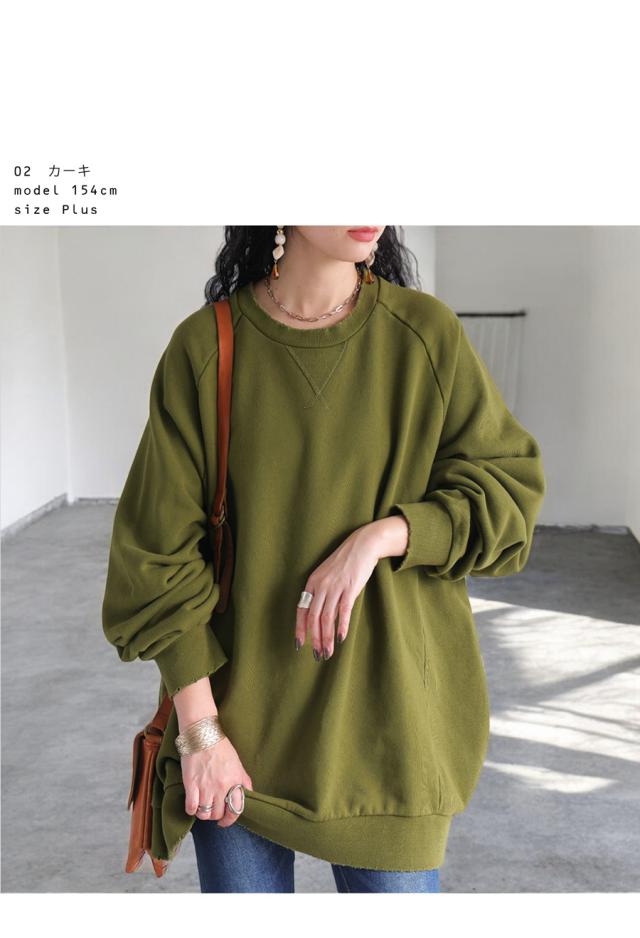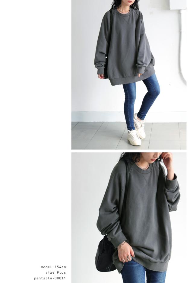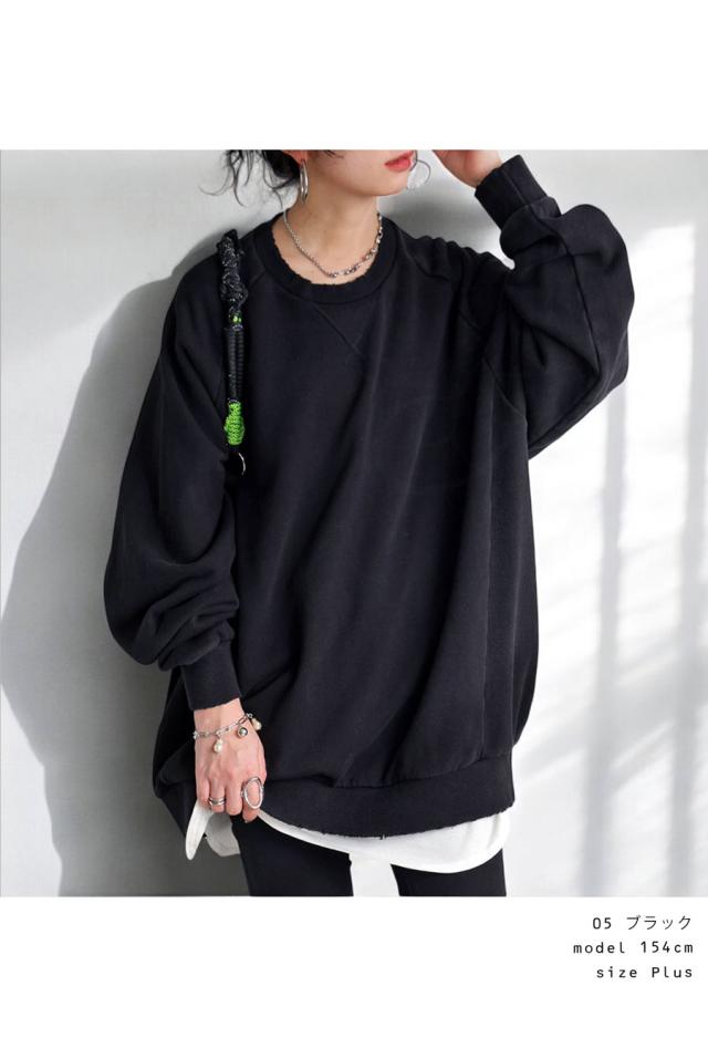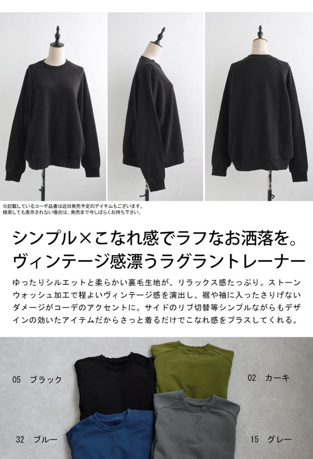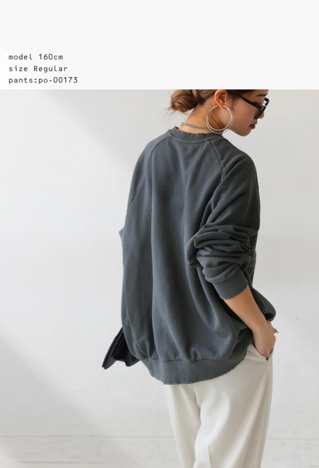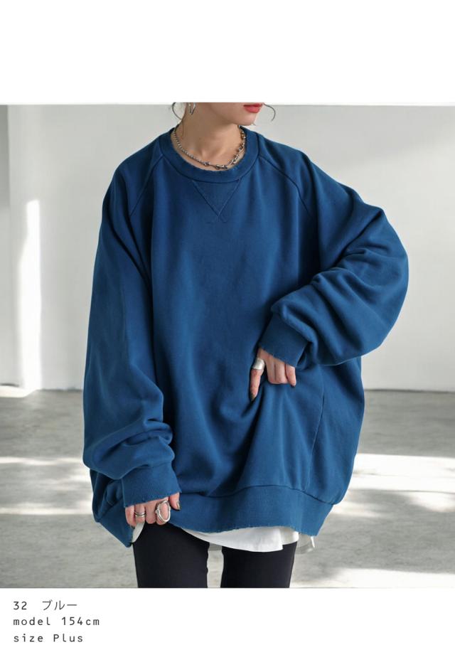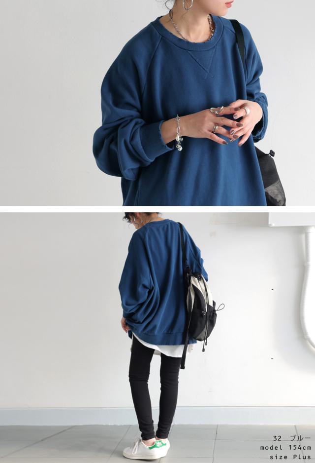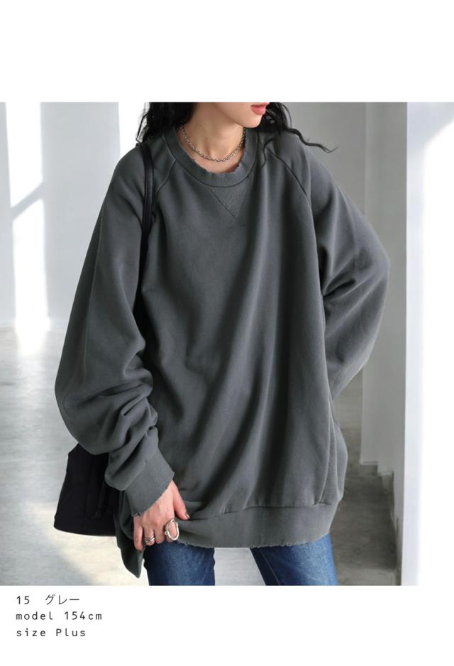 za-00247 長袖 クルーネック 丸首 無地 ラグラン スウェット シンプル 古着風 ヴィンテージ感 ダメージ加工 ストーンウォッシュ加工 ゆったり ラフ 裏毛 裏毛トップス 綿 コットン