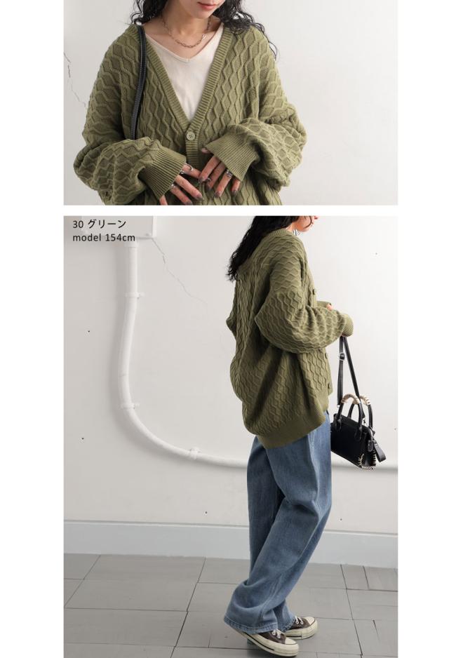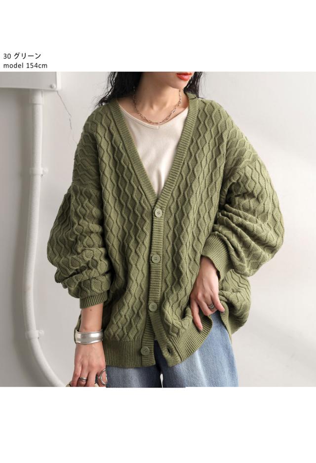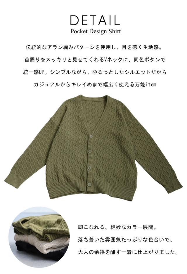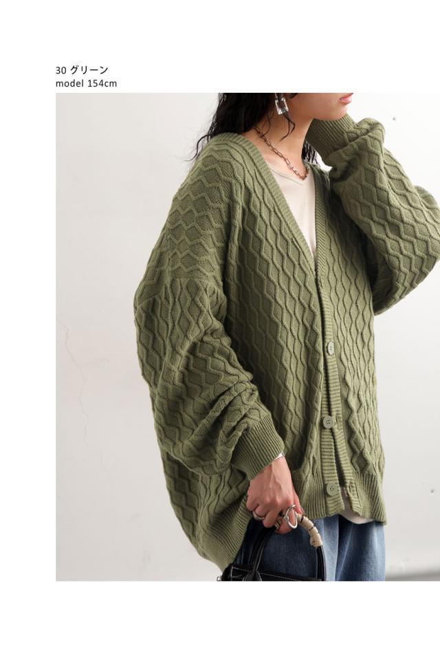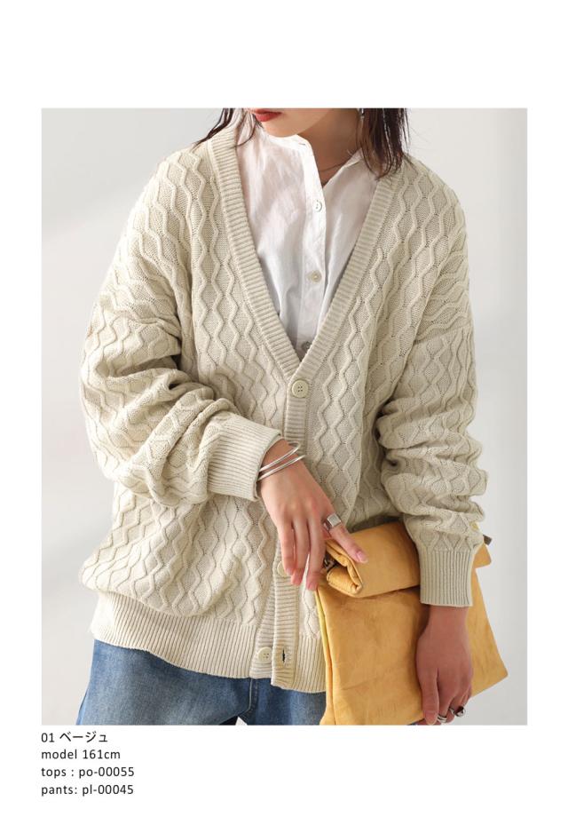 za-00248 アラン柄 柄編み 綿100 Vネック ゆったり ニットカーデ 羽織り ボタン 前開き 同色ボタン シンプル 綿 コットン コットンニット 体型カバー 着痩せ 大きいサイズ