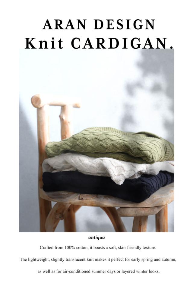 クラスカルな美しさに現代的な洗練さが融合した、アラン編みが特徴的なニットカーデ。