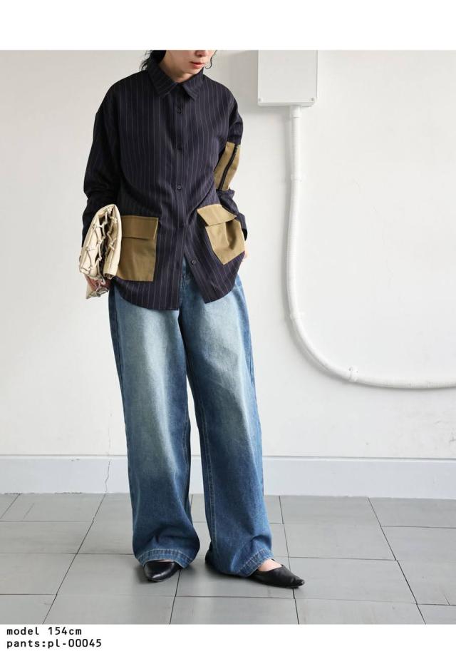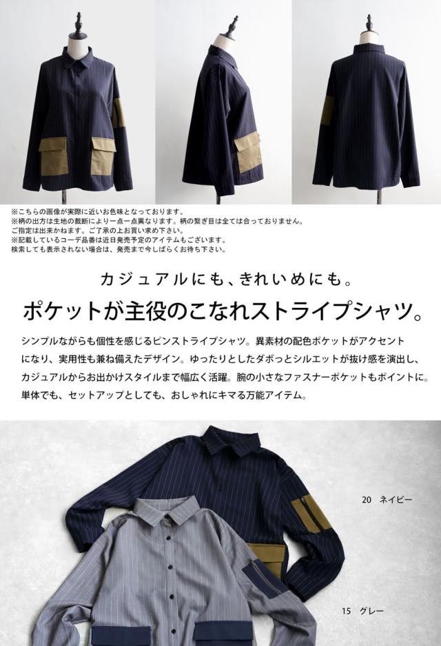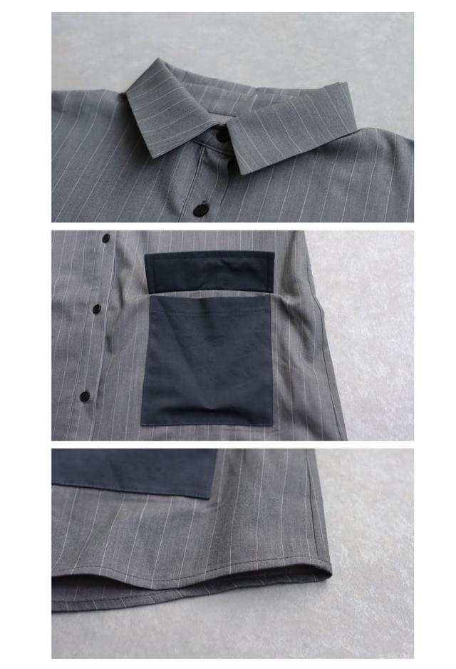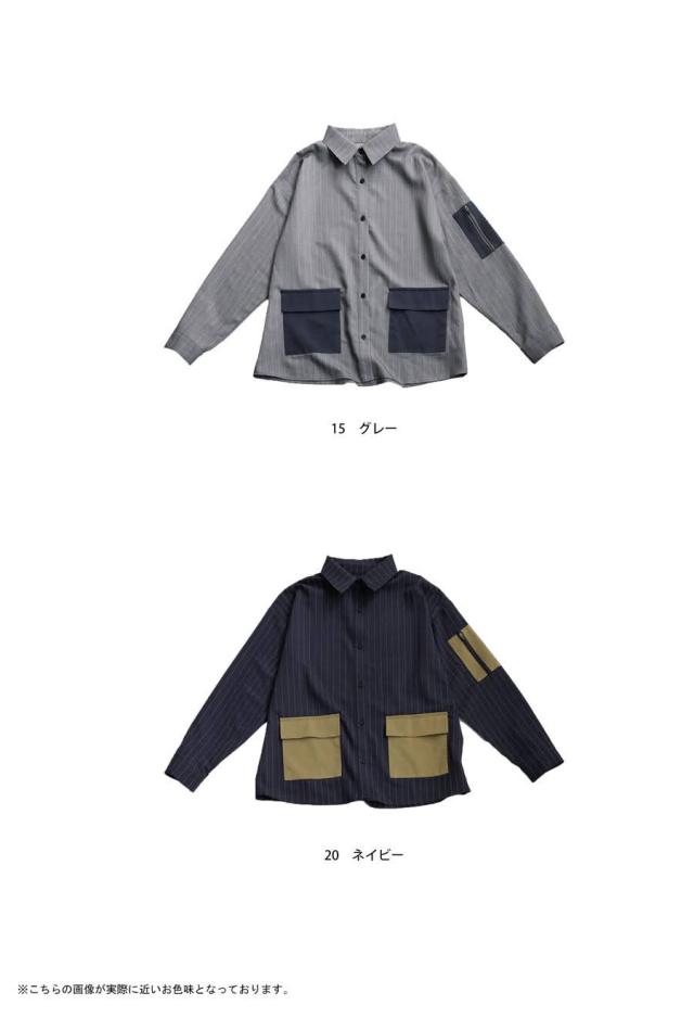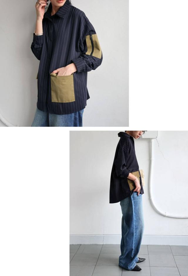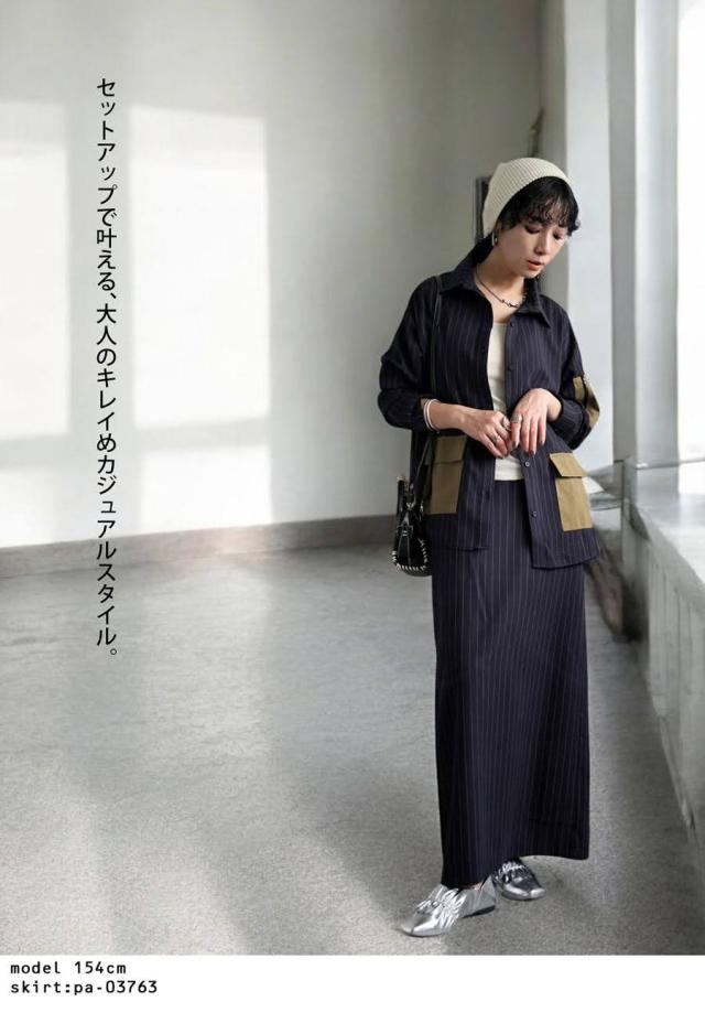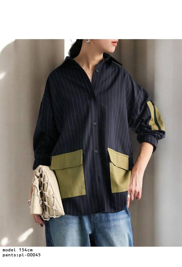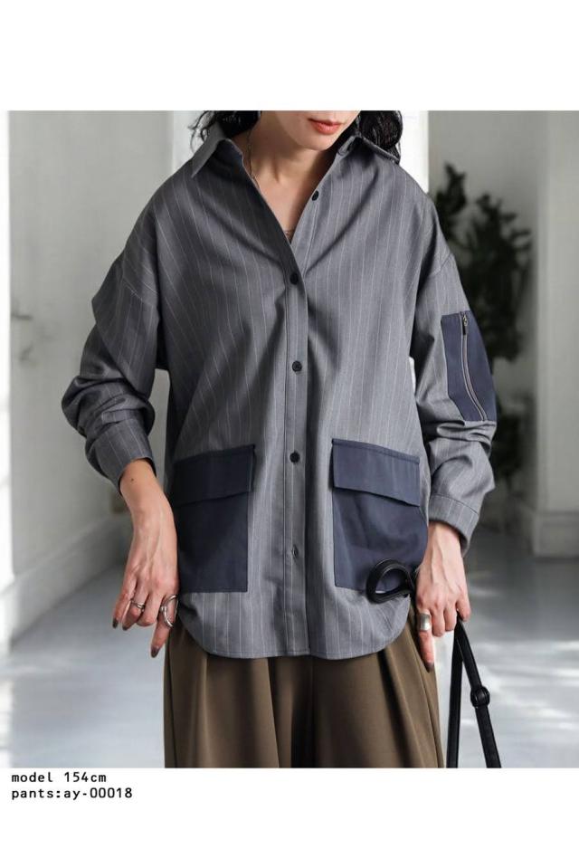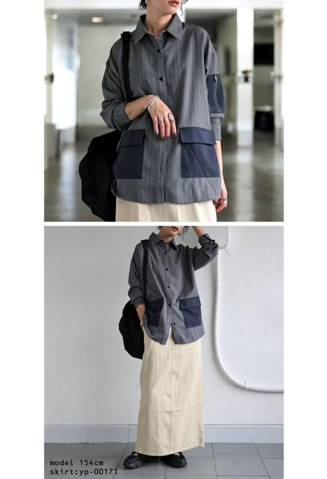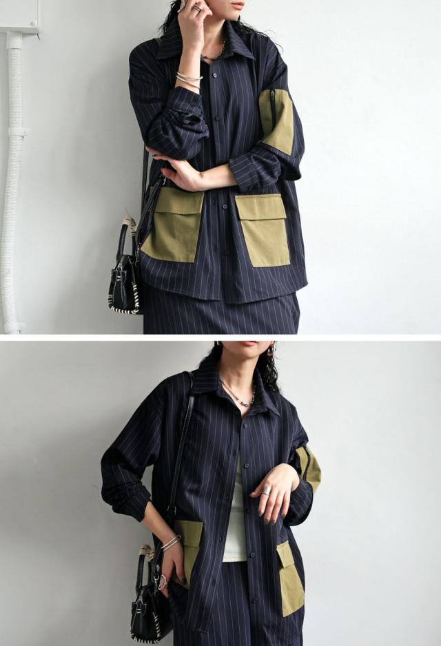 pa-03764 トップス 長袖 ストライプ 縦縞 しましま 柄シャツ 柄 総柄 シャツカラー 前開き ポケット付き セットアップ ゆったり ハイセンス 個性派 モード 体型カバー 着痩せ 大きめ