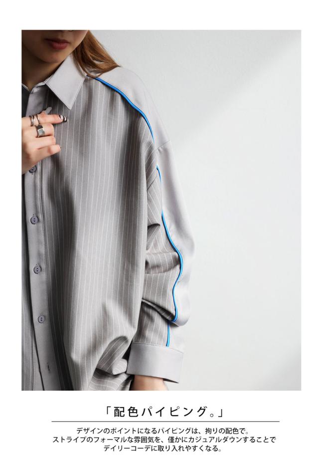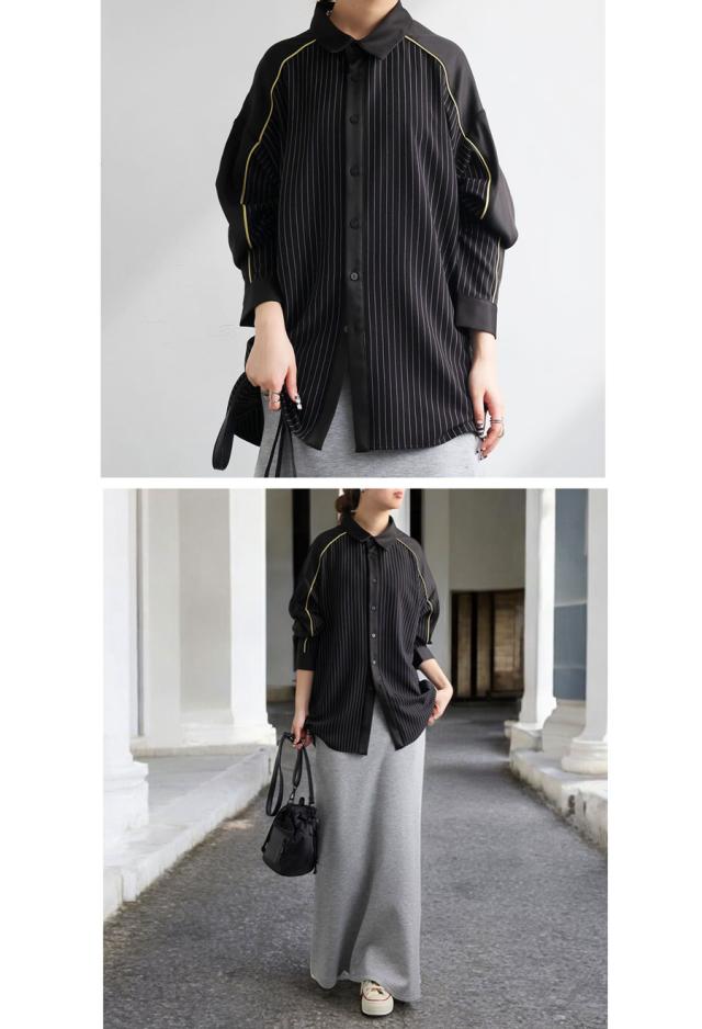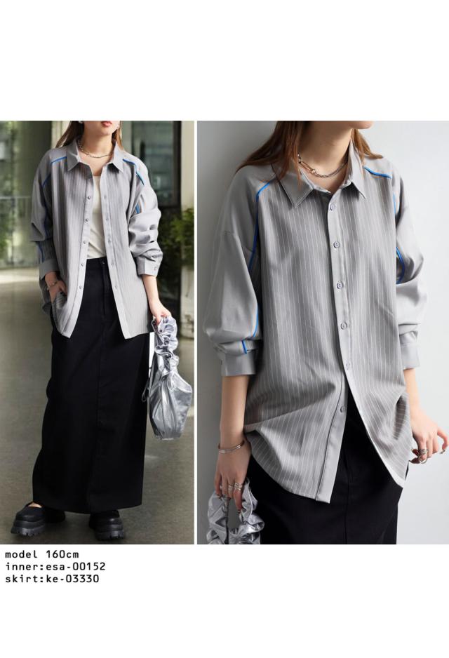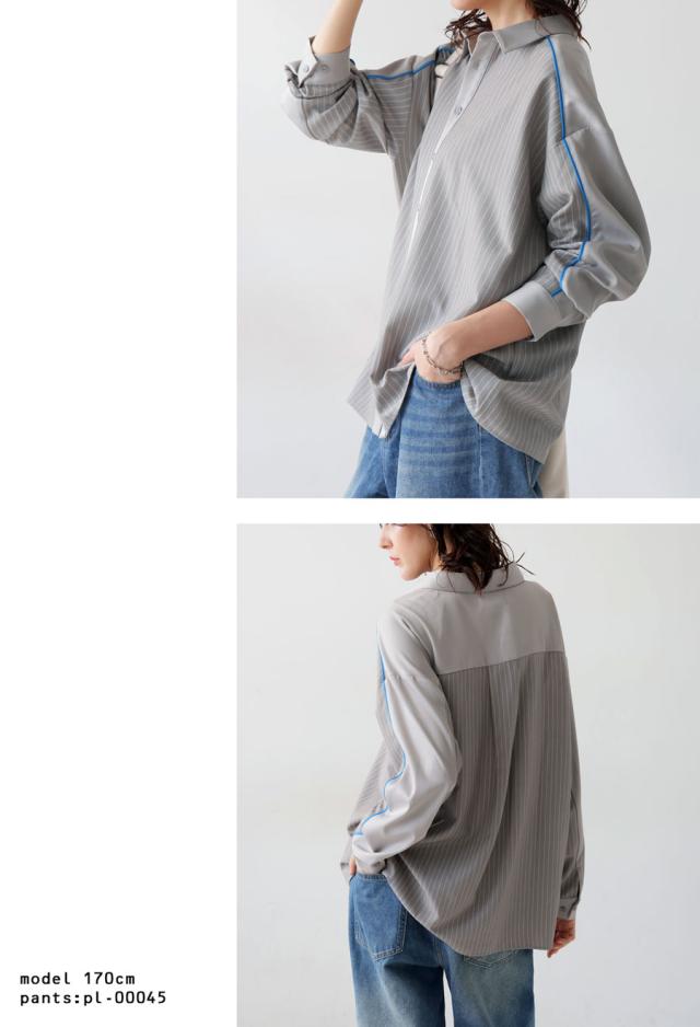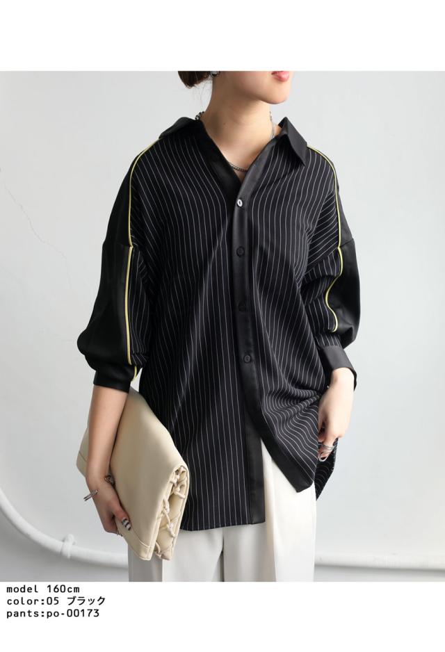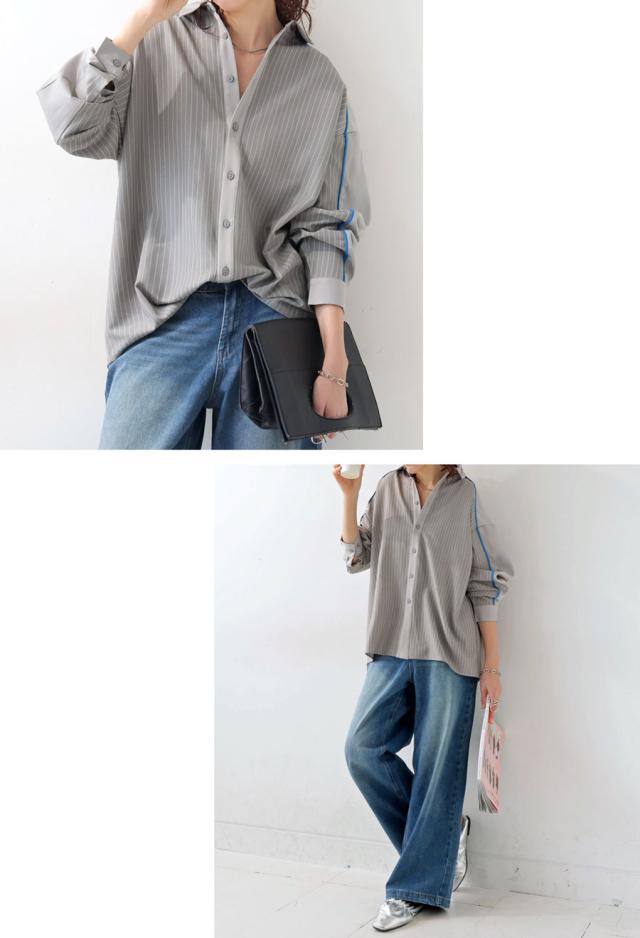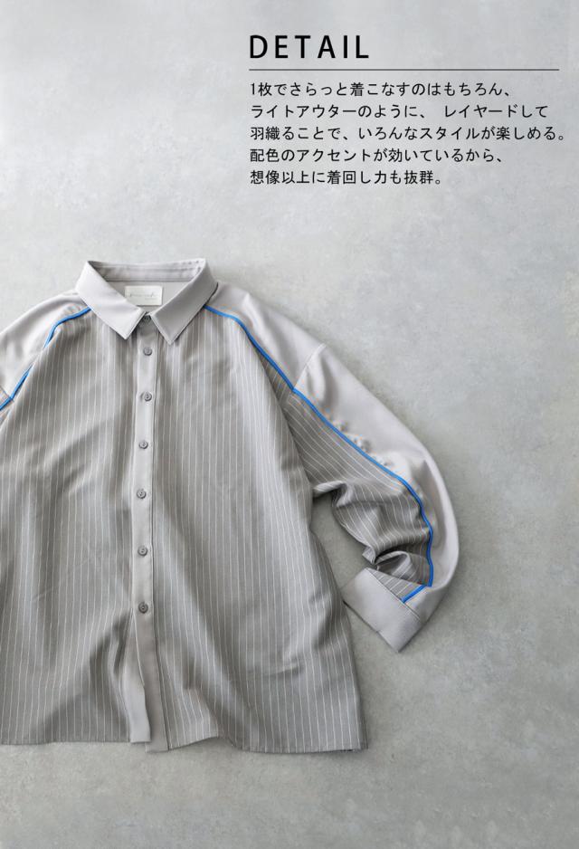 zk-00202 長袖 羽織り ストライプ柄 無地 切り替え 柄 ドッキング パイピング タック前開き オーバーサイズ ゆったり シンプル きれいめ 上品 体型カバー 細見え 華奢見え 大きめ
