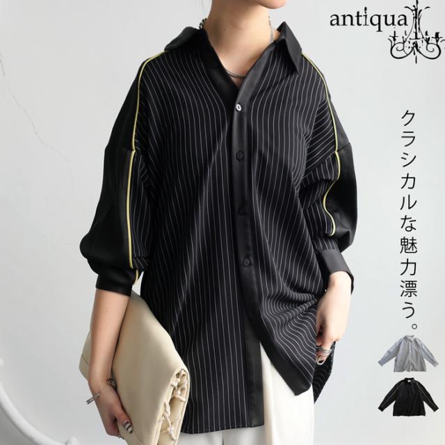 【検索ワード】ストライプ切替シャツ シャツ レディース トップス 長袖 羽織り ストライプ柄 ストライプ ピンストライプ 切り替え 柄 無地 配色 ドッキング パイピング カラーパイピング タック とろみ 前開き タック オーバーサイズ ゆったり クラシカル シンプル きれいめ 上品 体型カバー 細見え 華奢見え 大きめ 大きいサイズ レイヤード 重ね着 ユニセックス ブラック 黒 グレー antiqua treecafe アンティカ ツリーカフェ 大人 おしゃれ 10代 20代 30代 40代 50代 60代 春 秋 冬 お洒落 カジュアル かわいい かっこいい あんてぃか