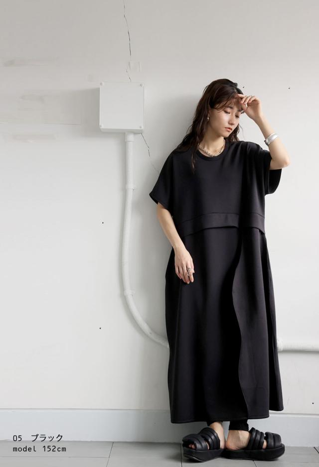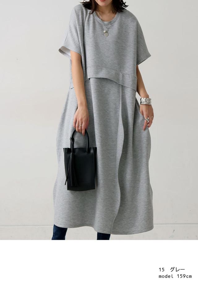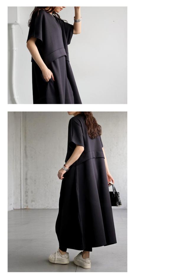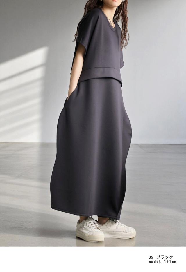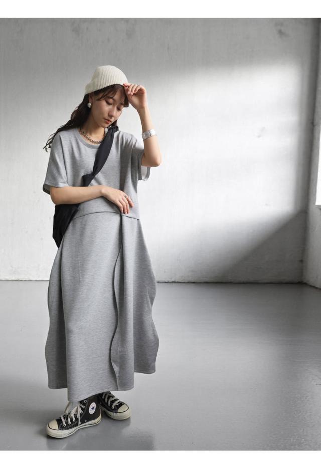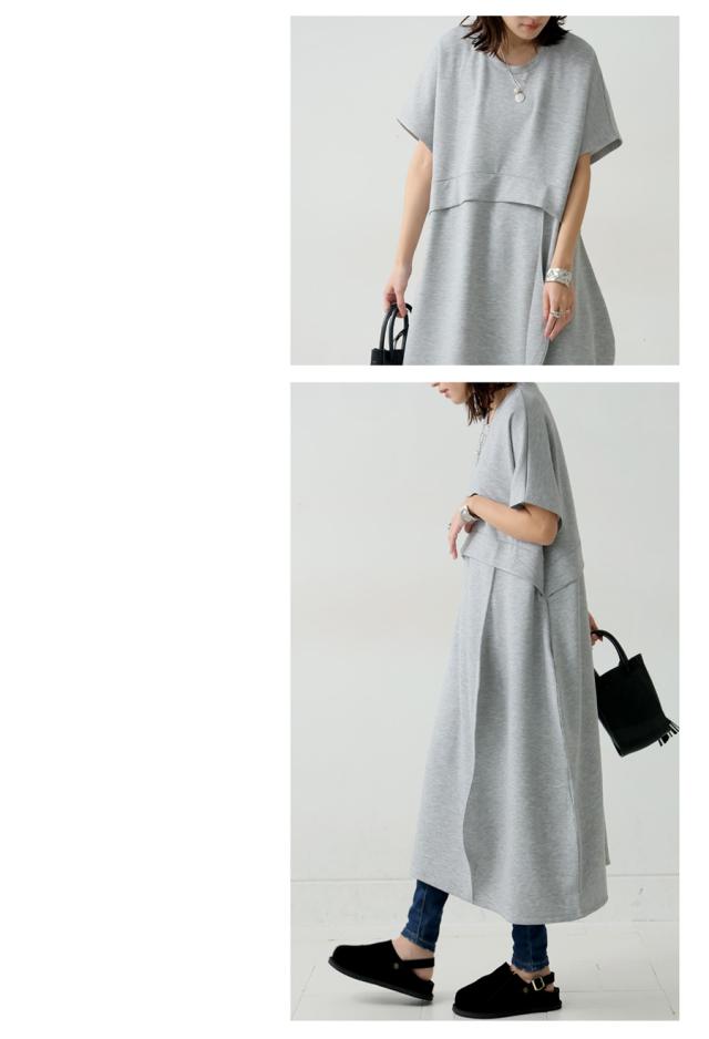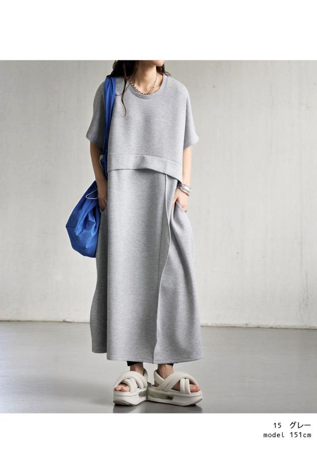 pa-03775 半袖 無地 クルーネック 丸首 スウェット スウェットワンピ スウェットワンピース ゆったり シンプル 楽ちん ラフ ロングワンピ ワンピ きれいめ 切り替え ウエスト切り替え
