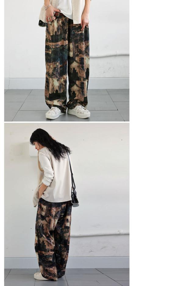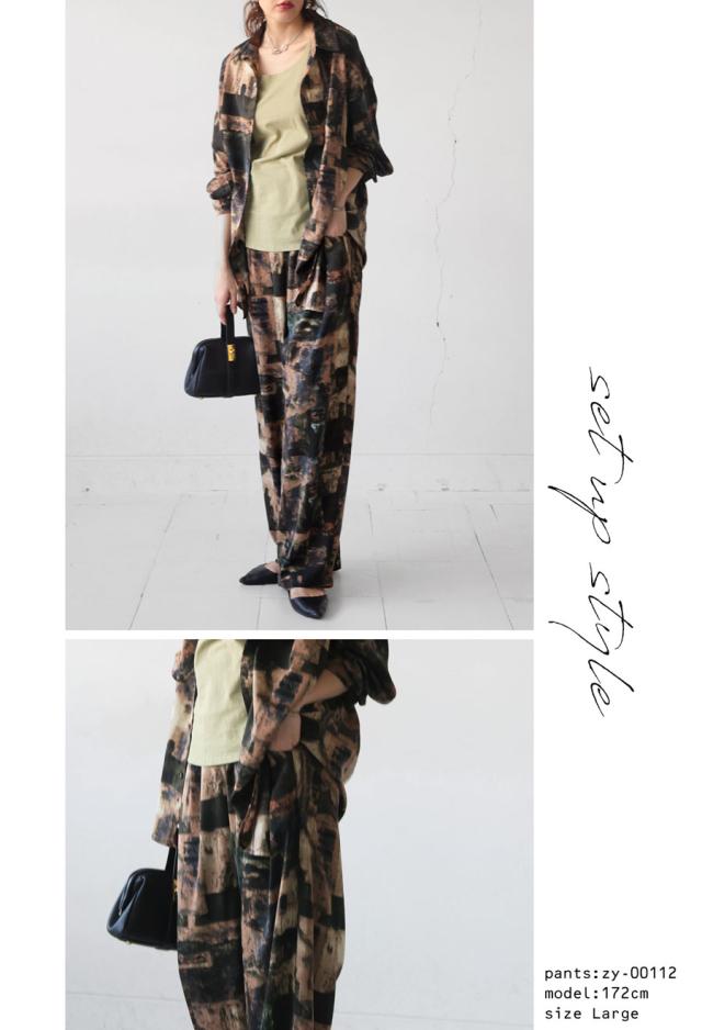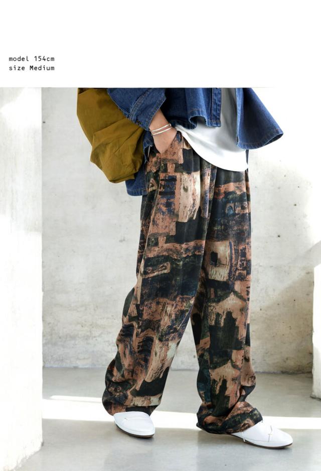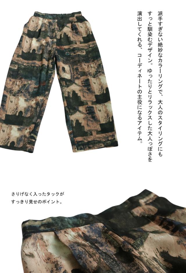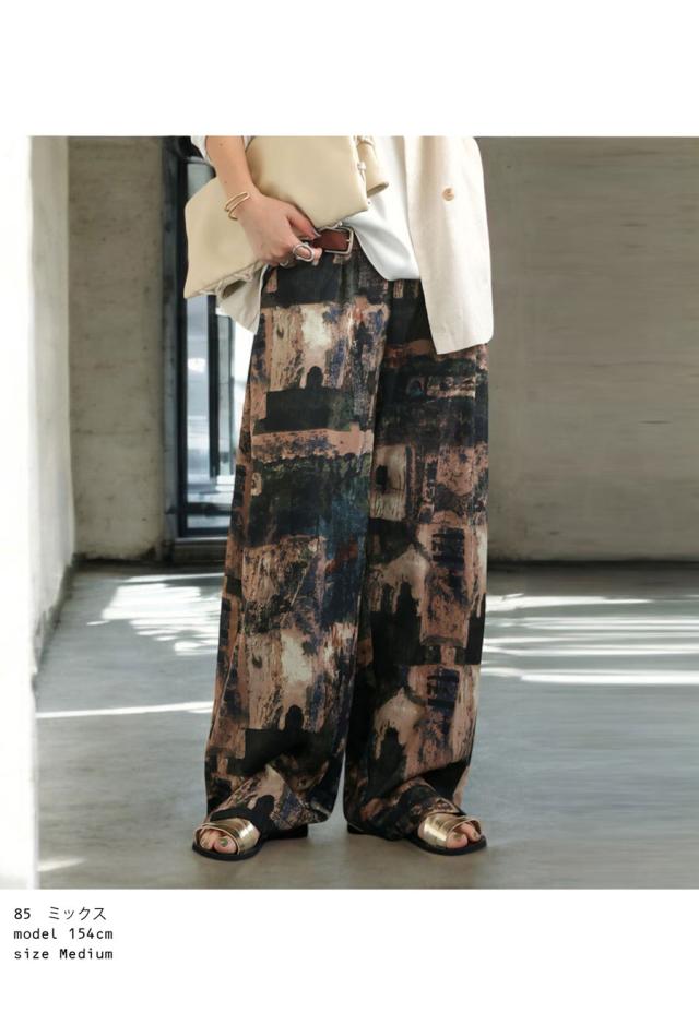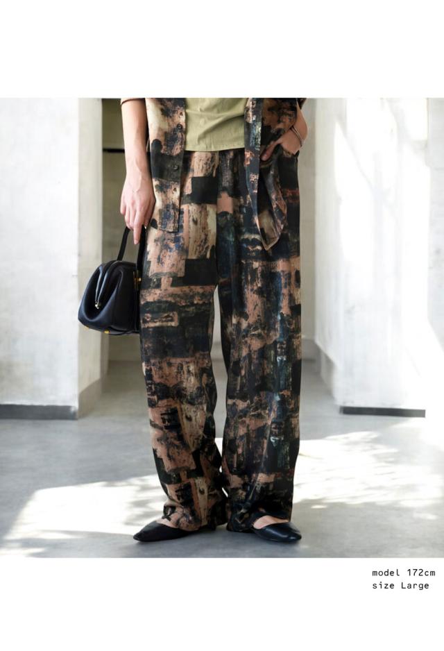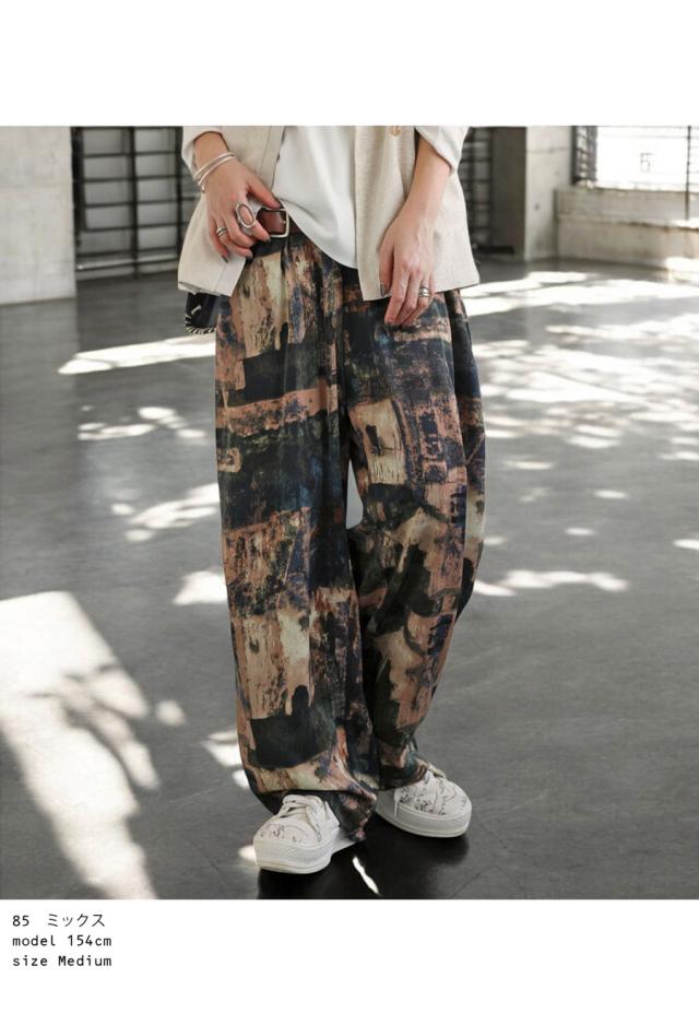 zy-00124 ロング 長ズボン ニュアンス柄 アート柄 柄パンツ 柄 コクーンシルエット 前フラット 後ろゴム ゆったり きれいめ 上品 高級感 美脚 体型カバー 細見え 華奢見え 着痩せ