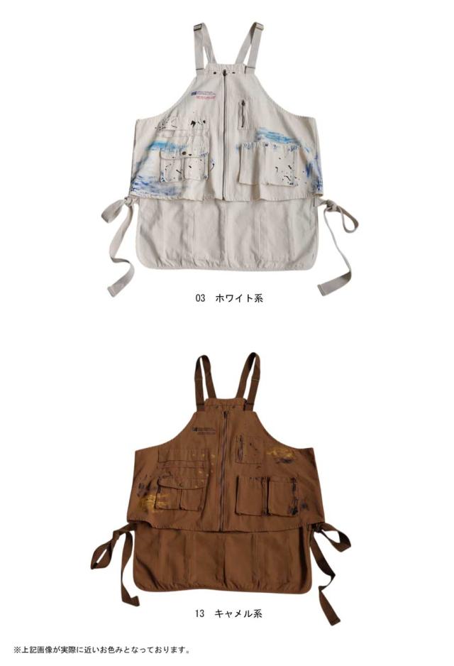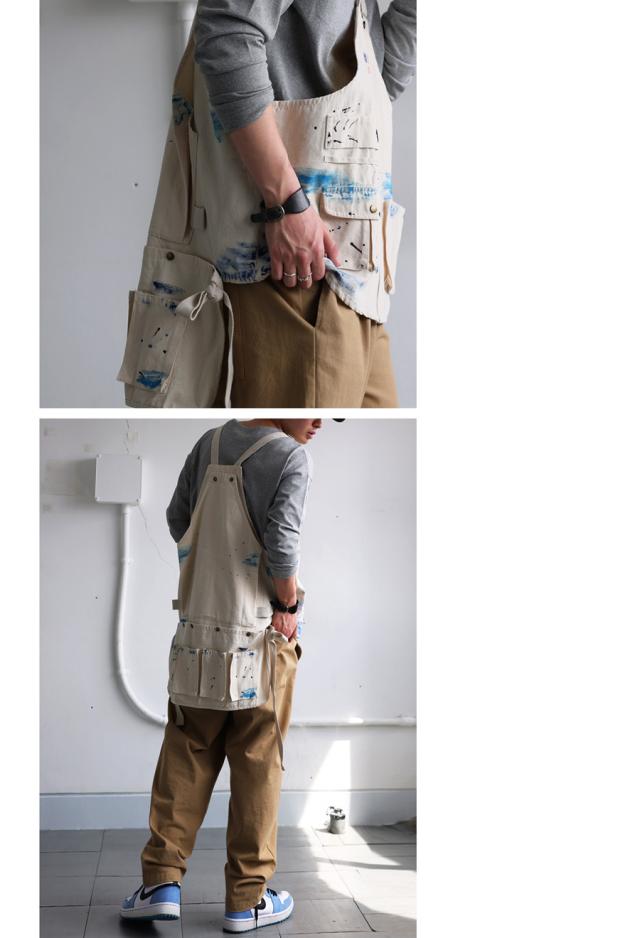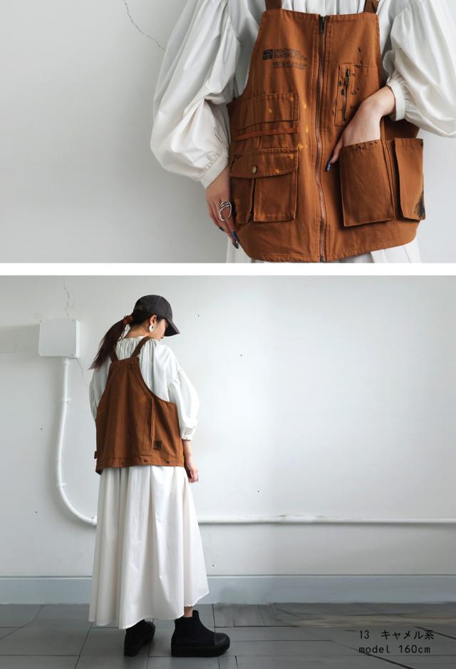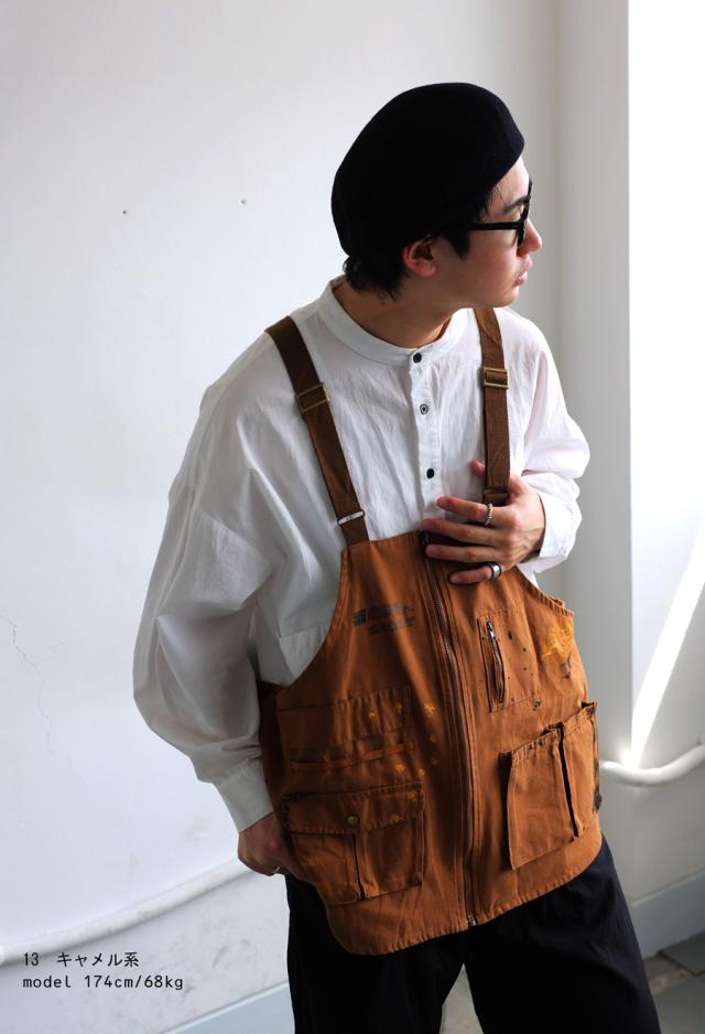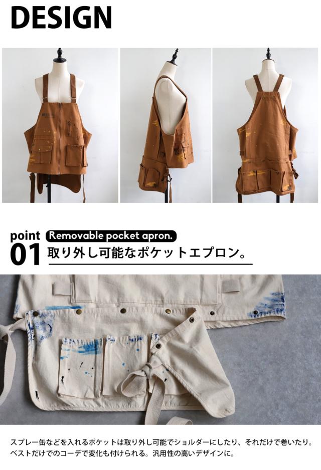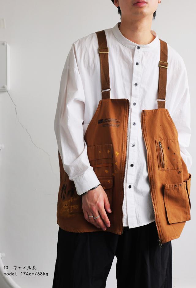 tab-0001 綿 コットン ゆったり アウトドア 前開き ファスナー ポケット ワークテイスト ハンドペイント エプロン ペン刺し キャンパス生地 取り外し可能 レイヤード ハンティングベスト