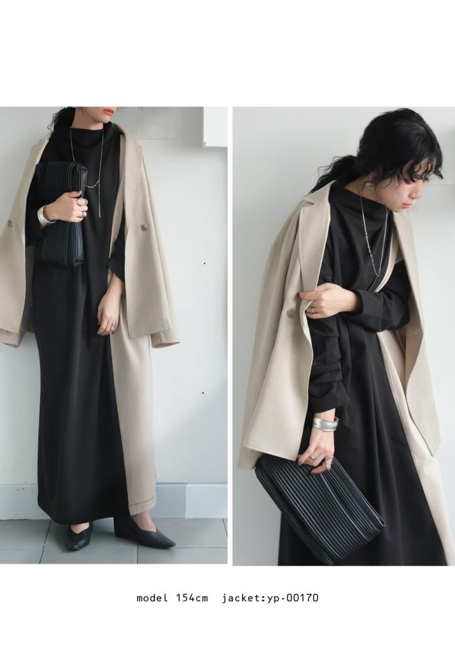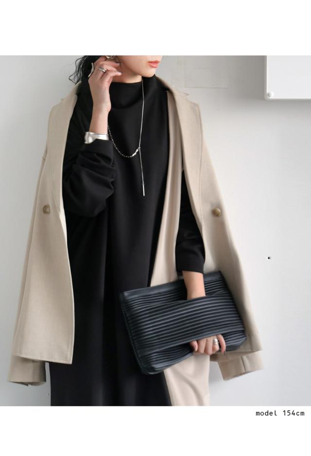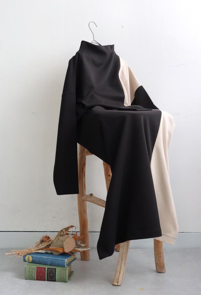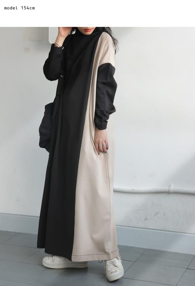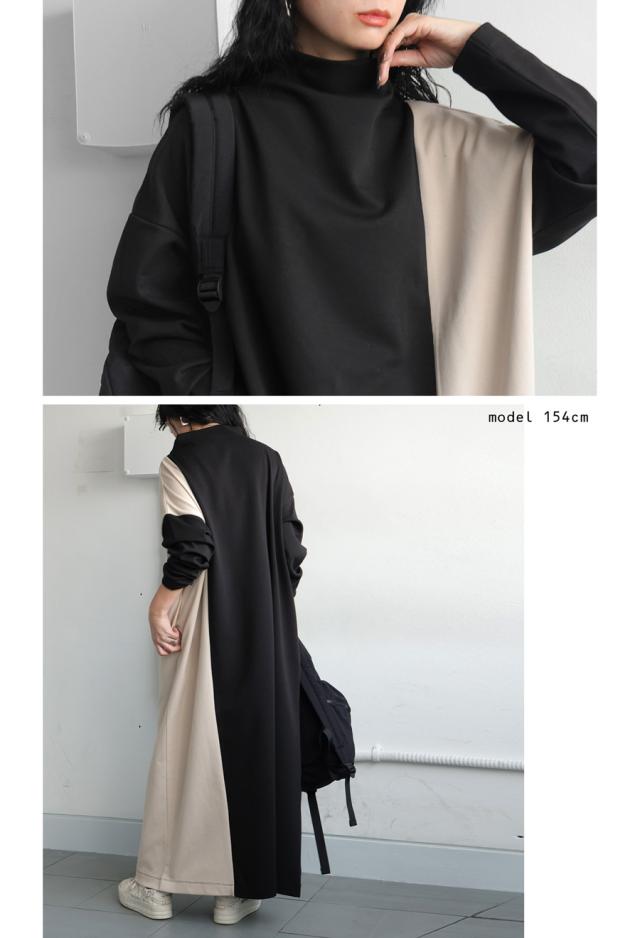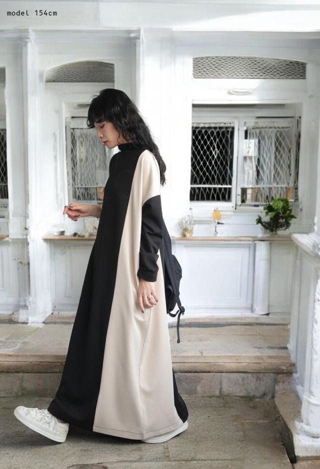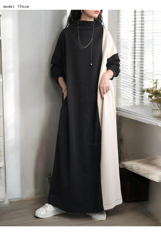 pn-00548 無地 配色 ゆったり シンプル きれいめ 上品 高級感 ロングワンピ ワンピ バイカラー オフタートル ボリューム 着痩せ 体型カバー 大きいサイズ 楽ちん ラフ