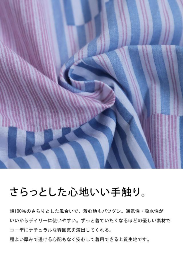 3種類の異なるストライプ柄を、まるでアートのように配置した独自の切り替えデザインは、一枚で印象を残せる存在感。