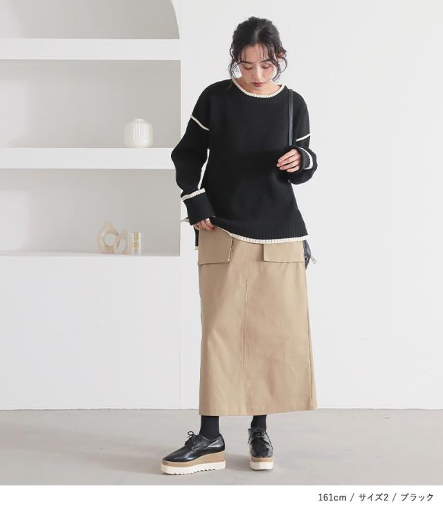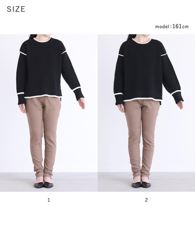 | staff:D/158cm B104 W90 H105 【普段着用】 Tops: L/LL Bottoms: L/LL | 【1】 袖丈:手の甲が隠れる位 着丈:ヒップ真ん中位 腕周り:ジャスト バスト:ジャスト 全体:スッキリ 全体的にジャストなサイズ感ですが、窮屈感は全くなくラインも拾わず綺麗に着用できました。ボリュームのあるボトムに合わせるなら1でも良さそうです。 【2】 袖丈:手の甲が隠れる位 着丈:ヒップ下少し見える位 腕周り:ややゆったり バスト:ややゆったり 全体:ややゆったり より楽に着用できました。パンツでもスカートでも合わせやすそうです。 私の場合は、2を選びます。 |
