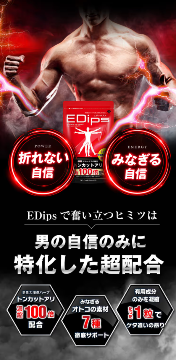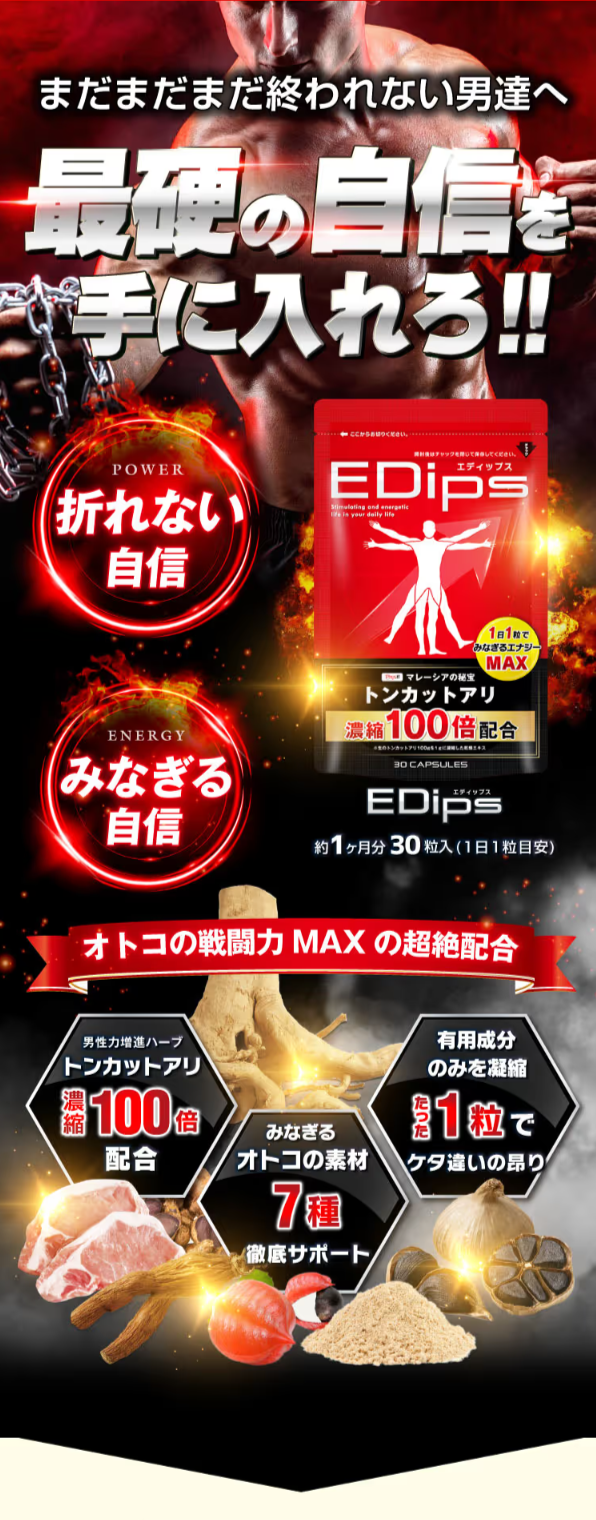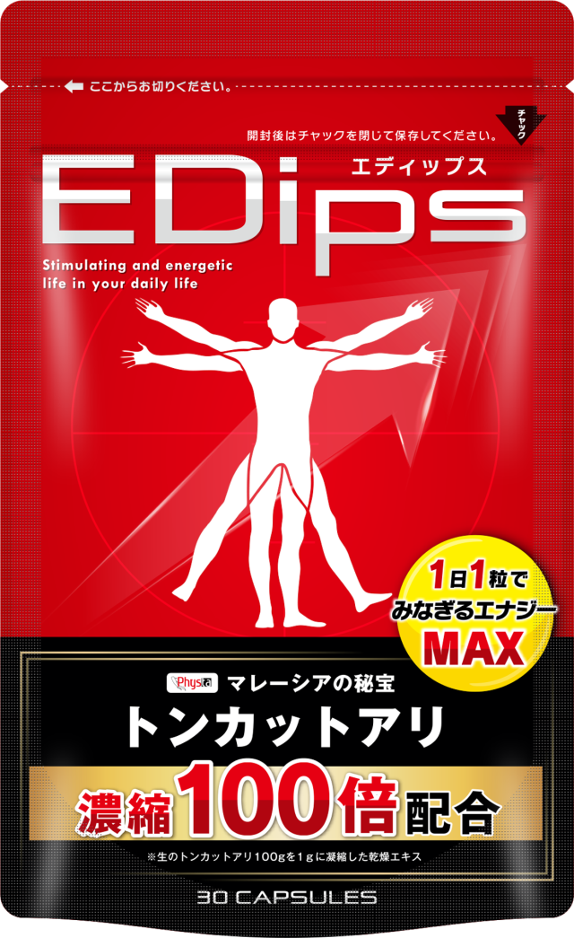 EDipsの最大の特徴は、何といっても「マレーシアの主砲」ともいわれるトンカットアリを、濃縮100倍していることです。トンカットアリは古くから滋養強壮サポートとして用いられてきた、非常に高価なハーブです。特に、トンカットアリに含まれるアルギニンは体内でテストステロンの分泌をサポートし、「誰もが憧れる強い男」へ促します。折れない自信×みなぎる自信をサポートするEDipsで、活力あふれる毎日をお過ごしください。