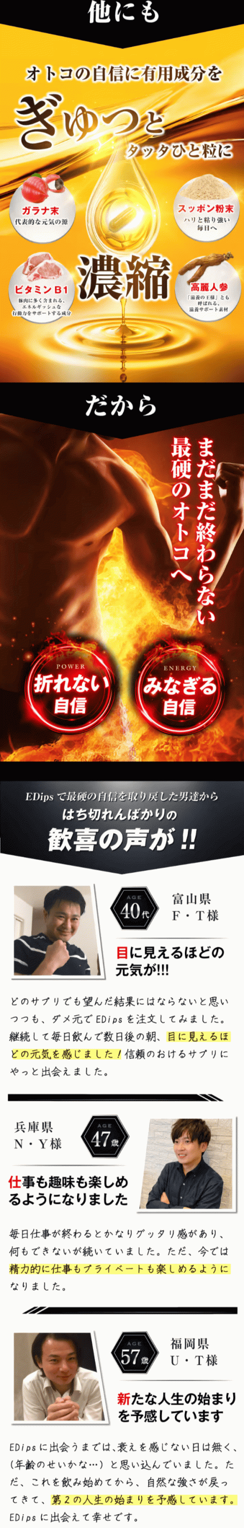 EDipsは男性の悩みに真剣に向き合い『生涯現役でありたい』『あの頃の元気を取り戻したい』と切に願う男性のために開発されました。安心・成分・信頼性・飲みやすさ、すべてにこだわり抜いたEDipsで、充実したオトコライフをお送りください。