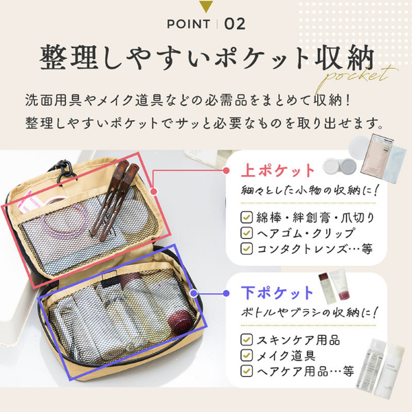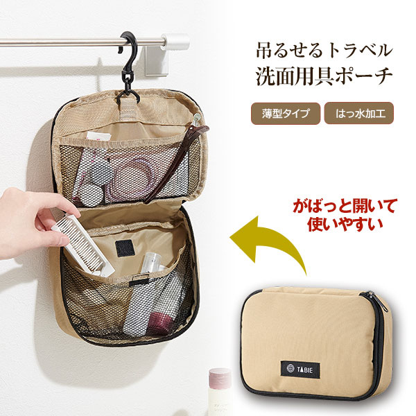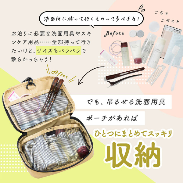 お出かけ時の必需品・身だしなみ用品をコレひとつに!サッと吊り下げて中身が見やすいトラベル洗面用具ポーチ。洗面用具やメイク道具をコンパクトに収納。薄型タイプで持ち運びに便利。ご自宅のアメニティ用品の収納用としても。はっ水加工で安心。フック×1、内側ポケット×2。●上ポケット …綿棒、絆創膏、爪切り、ヘアクリップ、ヘアゴム、コンタクトレンズ用品等●下ポケット …洗顔フォーム、化粧水、メイク落とし、ボディーソープ、シャンプー、リンス、ヘアオイル、折りたたみヘアブラシ、歯ブラシ、歯磨き粉、シェーバー等