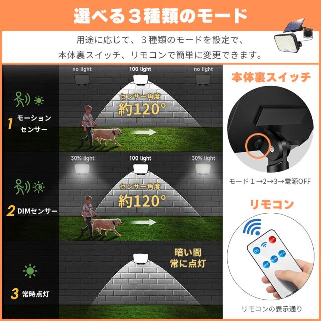 また、センサー範囲も広く暗くなると自動で常灯したり、センサー反応時だけ点灯したり、モードを3つから選ぶことができます。