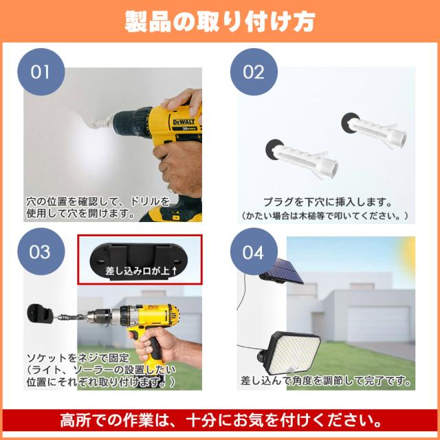 ※モーションセンサーを利用する場合は、ライト本体は2〜3mのの高さまでに設置してください。