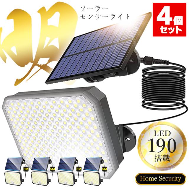 センサーソーラーライト 4個セット ソーラーライト センサーライト 白色 190LED 分離型 防犯 屋外 リモコン付き ソーラーパネル ソーラー 防水 壁付け 人感センサー 防犯ライト ガーデンライト アウトドア ソーラーフラッドライト モーションセンサー セキュリティライト