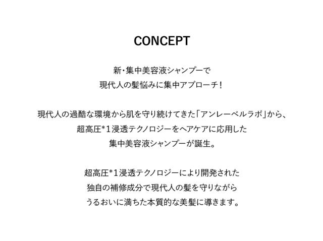 スキンケアで培われたアンレーベルの超高圧※1浸透テクノロジーをヘアケアにも応用。超高圧処理し、浸透力を高めた有用成分が髪の芯まで深く、素早く浸透し、髪のダメージに集中アプローチ。
