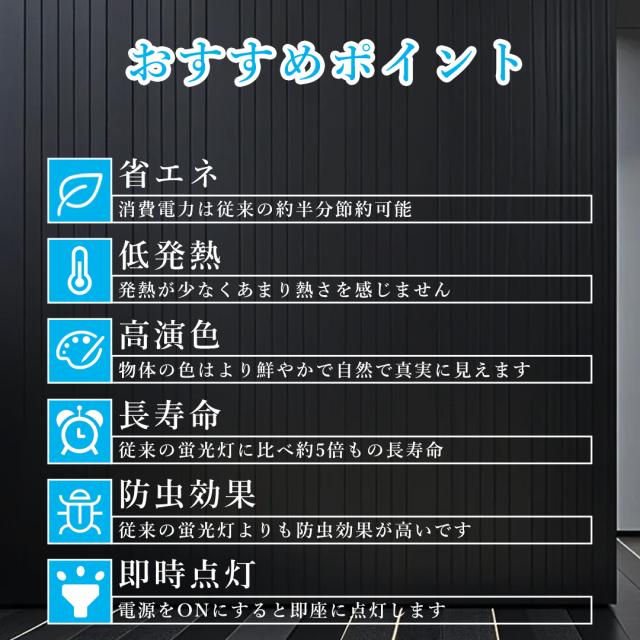 【快適な照明環境】:ちらつきを抑える,虫が寄りつきにく,病院・オフィス・学校・公共場所・展示場・製薬会社・食品工場・営業所・工場などノイズ対策必要な場所にもご満足いただけます。