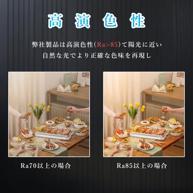 - もの本来の自然な色を忠実に再現できるRa85です。インテリアにおいて、照明に対する要求を十分に満たします。