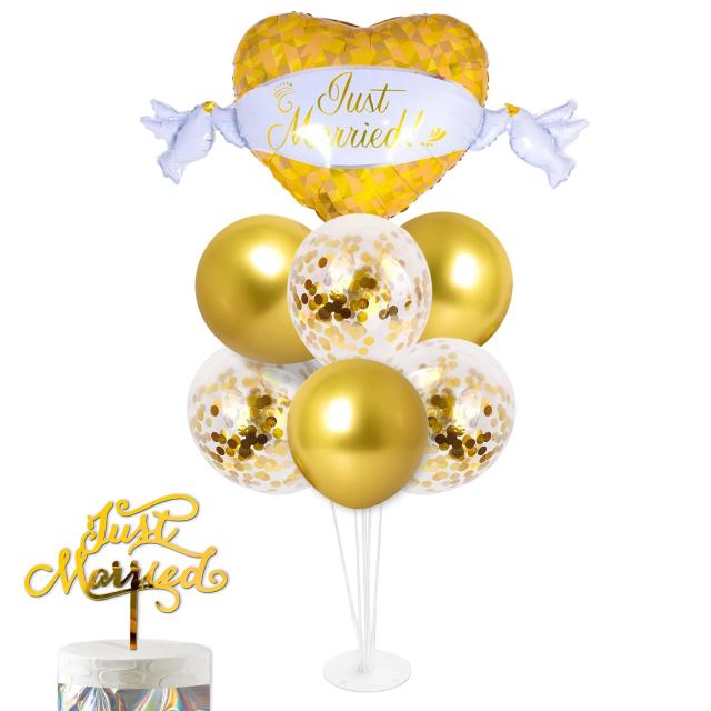 ?【セット内容】 ?「Just Married」アルミバルーン x1、?ゴールド紙吹雪バルーンx4、?メタリックゴールド・ゴム風船x4、?バルーンスタンド x1、?「Just Married」ケーキトッパー x1