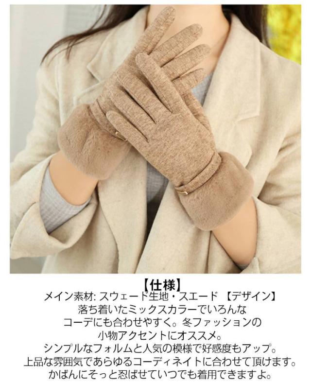 | 【保温性抜群】可愛いレディース手袋はスエードで作られ、内側裏起毛でしっかり暖かい、袖口は起毛のデザインで冷たい風を裏に通しにくくなり、保温性と防風性が高いので、寒さからしっかり守ってくれます。 【タッチパネル対応 】タッチスクリーンに触れる機会が多い今、寒い季節の手袋は着けたり外したりする手間が多く困りもので、タッチスクリーン対応のこのグローブなら着けたままスムーズな画面操作が可能。人差し指の指先には導電性繊維を採用、手袋をはめたままスマホ等の操作ができてとても便利。 【仕様】メイン素材: スウェード生地・スエード 【デザイン】落ち着いたミックスカラーでいろんなコーデにも合わせやすく。冬ファッションの小物アクセントにオススメ。シンプルなフォルムと人気の模様で好感度もアップ。上品な雰囲気であらゆるコーディネイトに合わせて頂けます。かばんにそっと忍ばせていつでも着用できますよ。 【様々なシーンで適用】フリーサイズと可愛いいなデザインで、プレゼントとして家族、友達に送る絶好の選択になります。指先から手まで完全に包んで、寒い日の通勤、通学、旅行、凍えるような夜のデートやお出かけなどに最適です。 | |