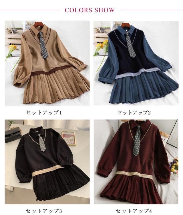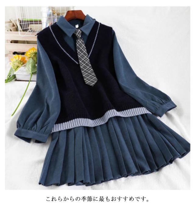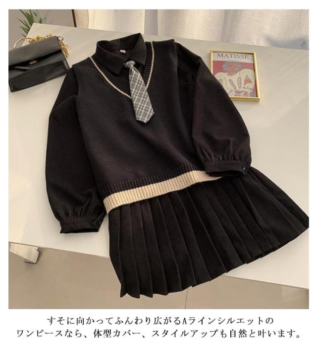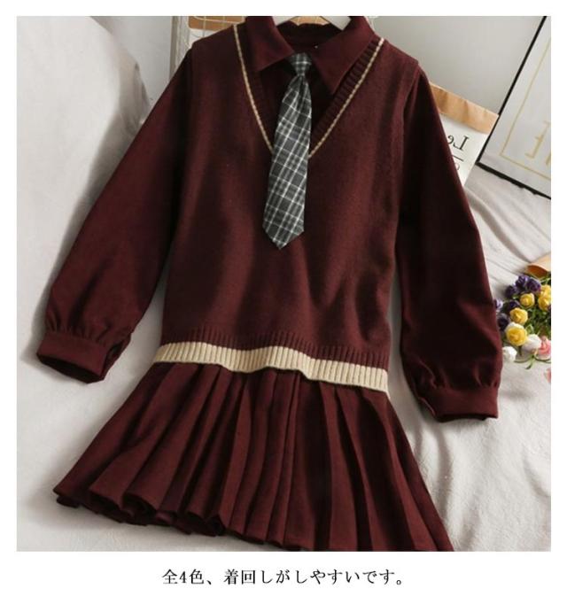 切り替え ベスト ベスト 韓国ファション 通学 セット ネックタイ付き ロングシャツ ニット Vネック チュニック プリーツワンピース セットアップ 重ね着風 S 通勤 ワンピース かわいい おしゃれ 体型カバー ニットベスト M L XL