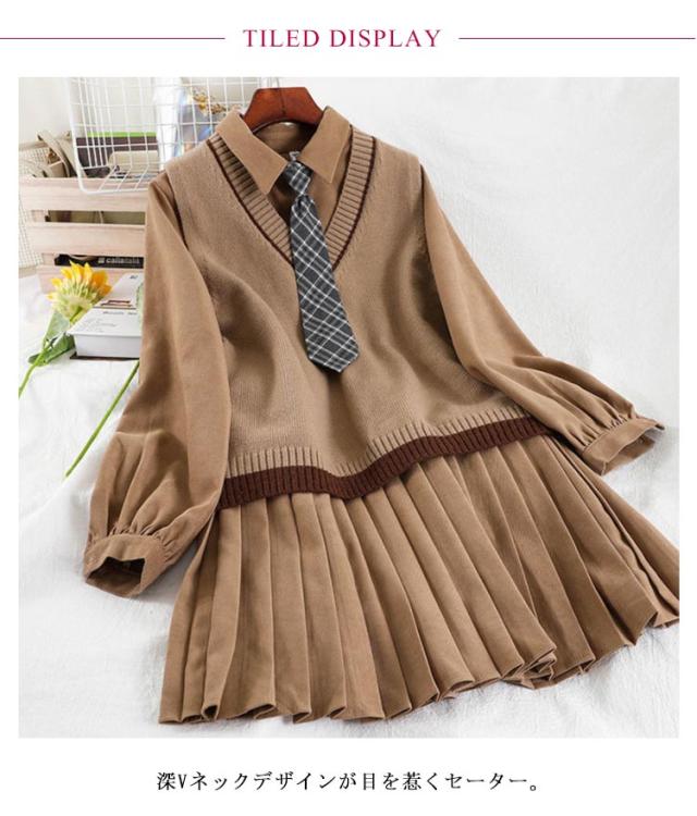 | ニットベスト+ワンピース+ネックタイの3点セット。 深Vネックデザインが目を惹くセーター。 すそに向かってふんわり広がるAラインシルエットのワンピースなら、体型カバー、スタイルアップも自然と叶います。 これらからの季節に最もおすすめです。 全4色、着回しがしやすいです。 | |