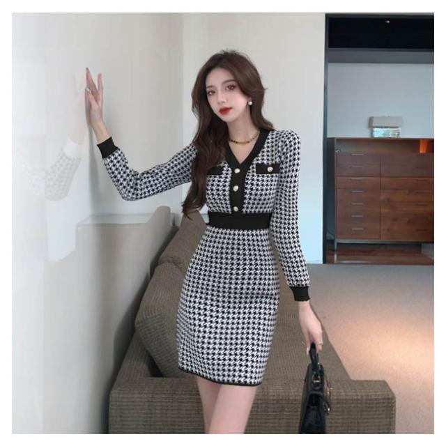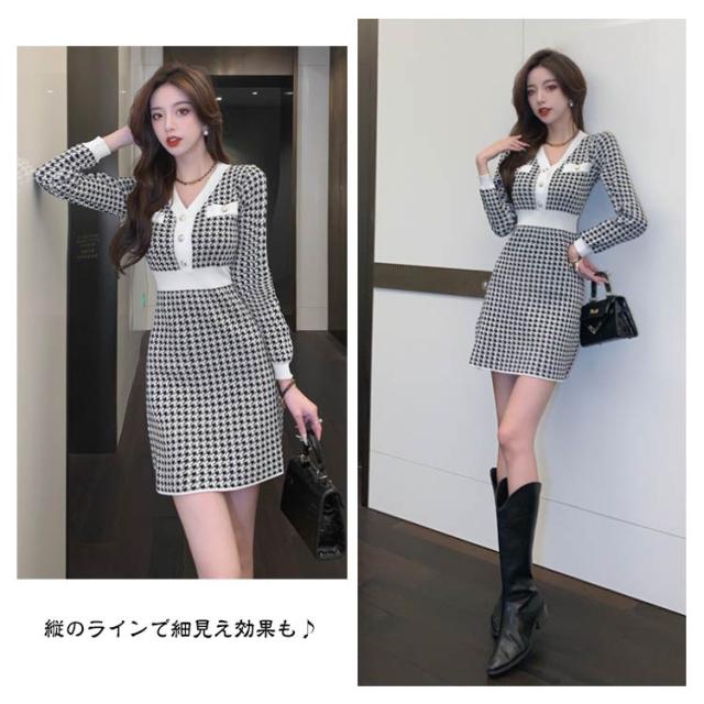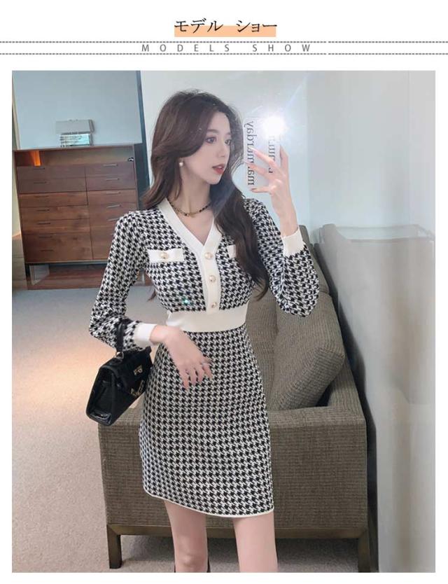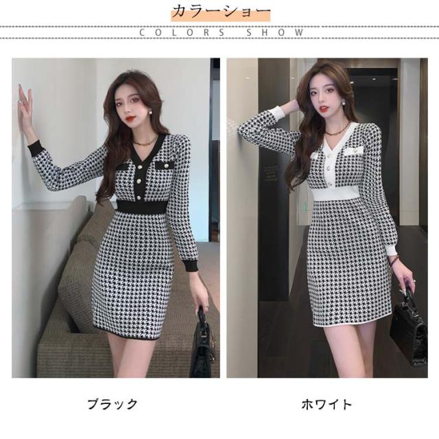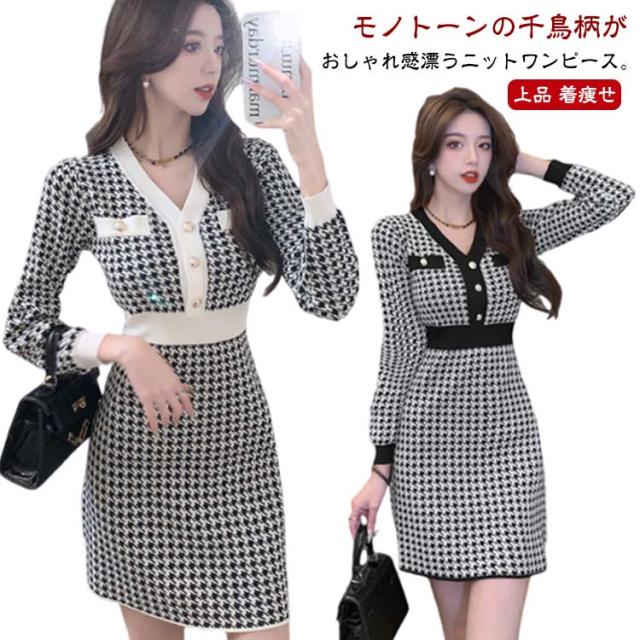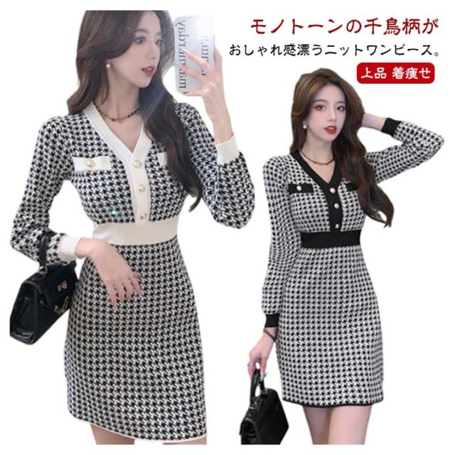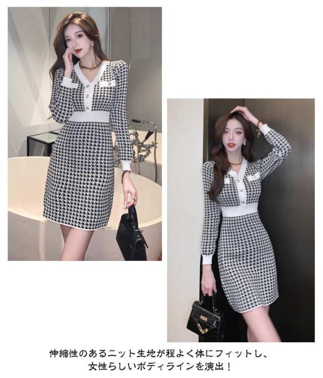 秋冬 ニット ショート丈 ミニ チュニック ニットソー きれいめ 千鳥格子柄 ニットワンピース Vネック 長袖 レディース チュニックワンピース ニットワンピ ワンピース フィット タイトワンピース 上品 ミニ丈 着痩せ 大人 かわいい