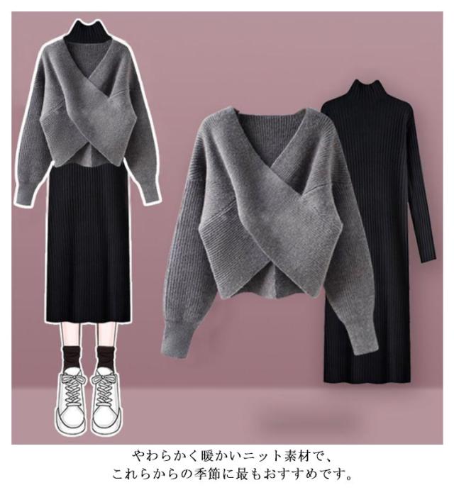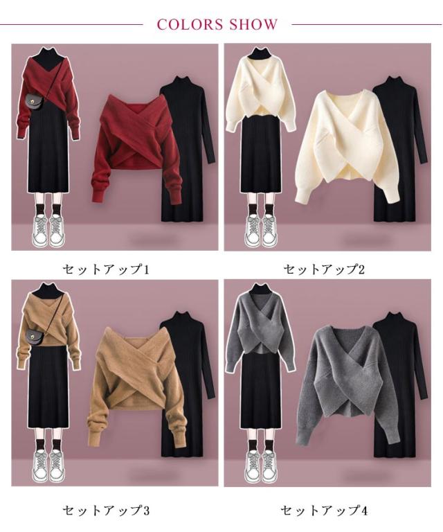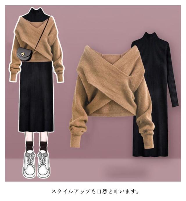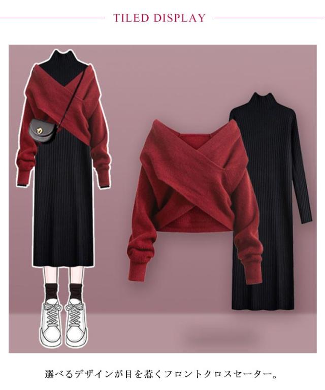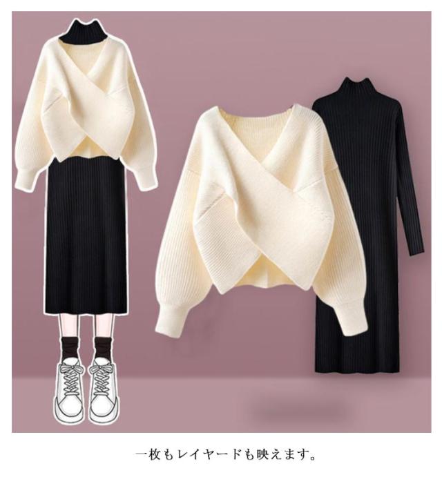 | ニットワンピース+セーター2点セット。 選べるデザインが目を惹くフロントクロスセーター。 一枚もレイヤードも映えます。 スタイルアップも自然と叶います。 やわらかく暖かいニット素材で、これらからの季節に最もおすすめです。 セットアップで着用するのはもちろん、単品としても着回しがしやすいです。 | |