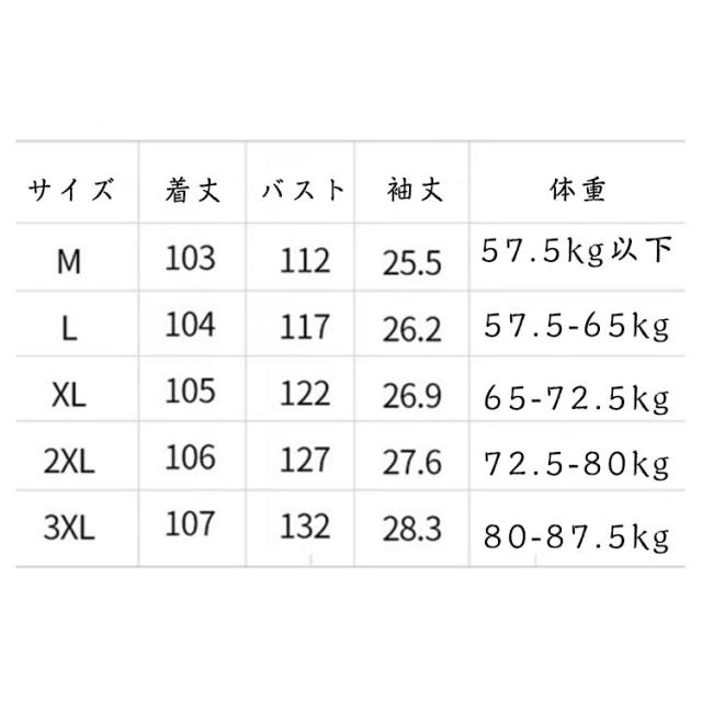 | サイズについての説明 | M 着丈103cm バスト112cm 袖丈74cm 体重57.5kg以下 L 着丈104cm バスト117cm 袖丈75.5cm 体重57.5-65kg XL 着丈105cm バスト122cm 袖丈77cm 体重65-72.5kg 2XL 着丈106cm バスト127cm 袖丈78.5cm 体重72.5-80kg 3XL 着丈107cm バスト132cm 袖丈80cm 体重80-87.5kg |