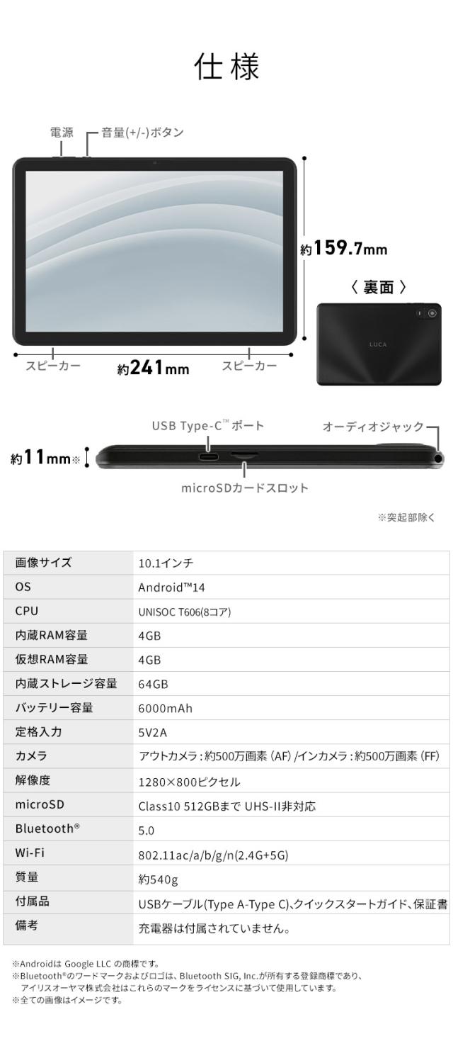 (検索用:タブレット・10インチ・Wi-Fiモデル・android14・8コア・64GB・保護フィルム貼付済・軽量・日常使い・動画・ネット・電子書籍・読書・シンプル・4967576728256・アイリスオーヤマ)