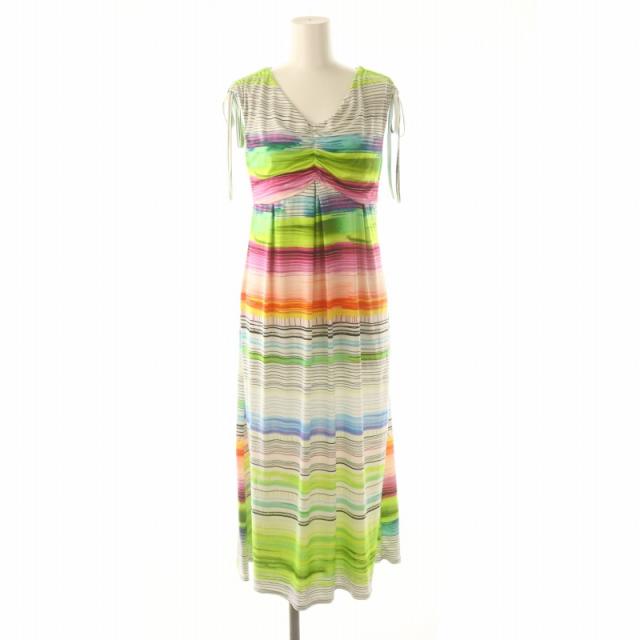 【中古】フィフィーユ ワンピース ロング マキシ ボーダー Vネック ギャザー リボン ノースリーブ マルチカラー