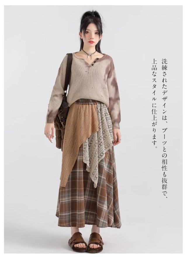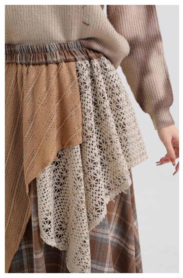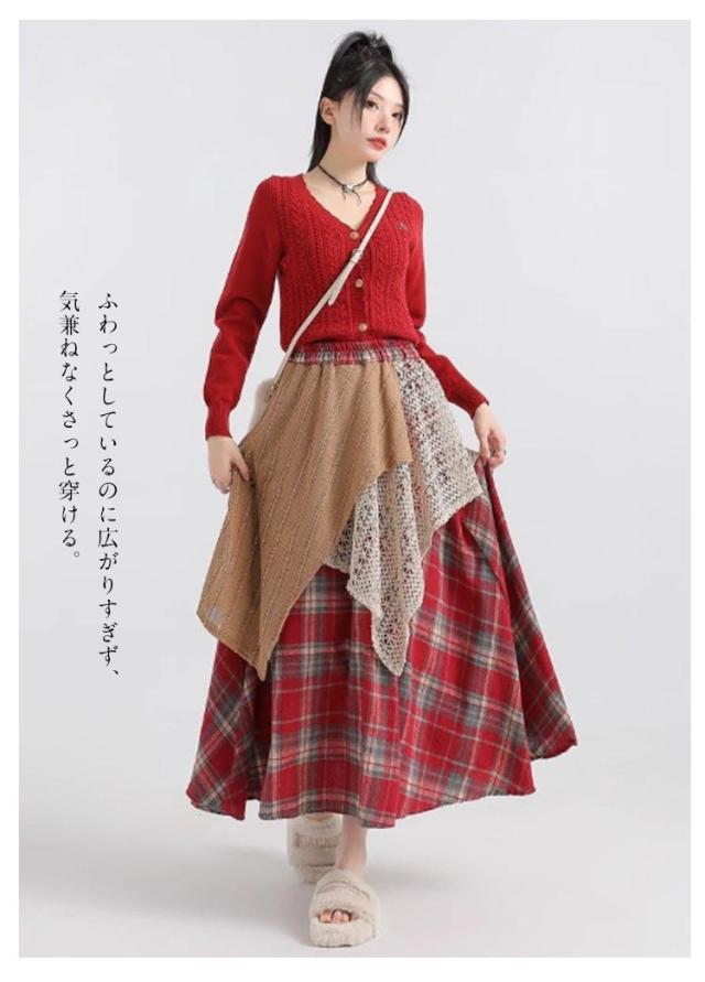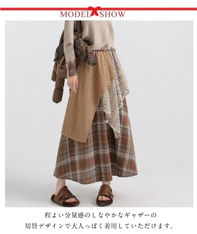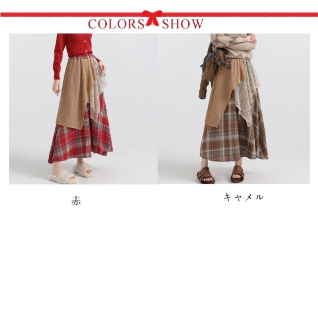 アシンメトリー チェックスカート レディース スカート 重ね着風 切り替え 秋冬 ロングスカート 総柄 不規則 イレギュラー アシメ レイヤード フレアスカート ウエストゴム きれいめ カジュアル シンプル 体型カバー ボトムス