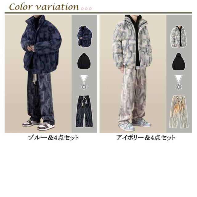 4点セット 厚手 中綿 防寒ウエア パンツ セットアップ 上下セット ジャケット パーカー キルティング 中綿ジャケット 長袖 裏起毛 ボア ジップパーカー メンズ 中綿入り フード付き ウインドブレーカー ダウン風 あたっか 部屋着 長ズボン 送料無料
