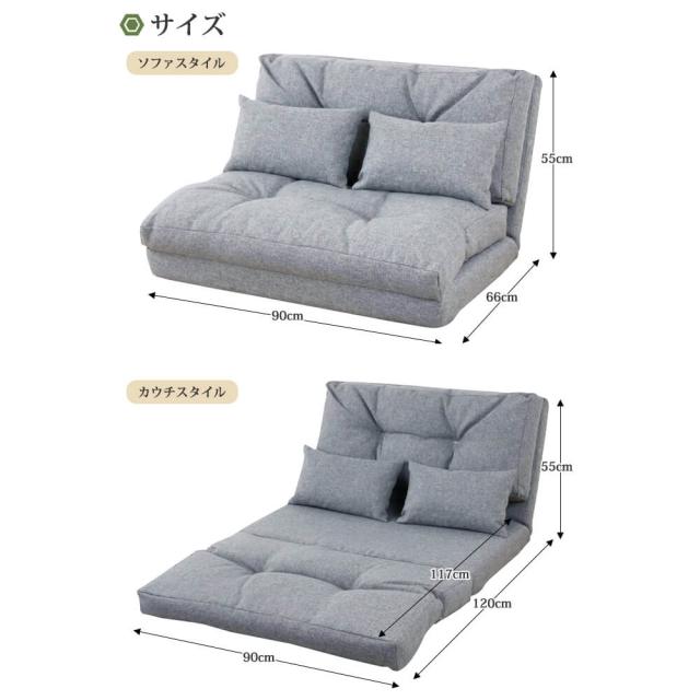 本体 : 幅 90cm x 奥行 66cm 〜 120cm x 高さ 55cm / 10cmクッション:42cm x 24cm x 13cm