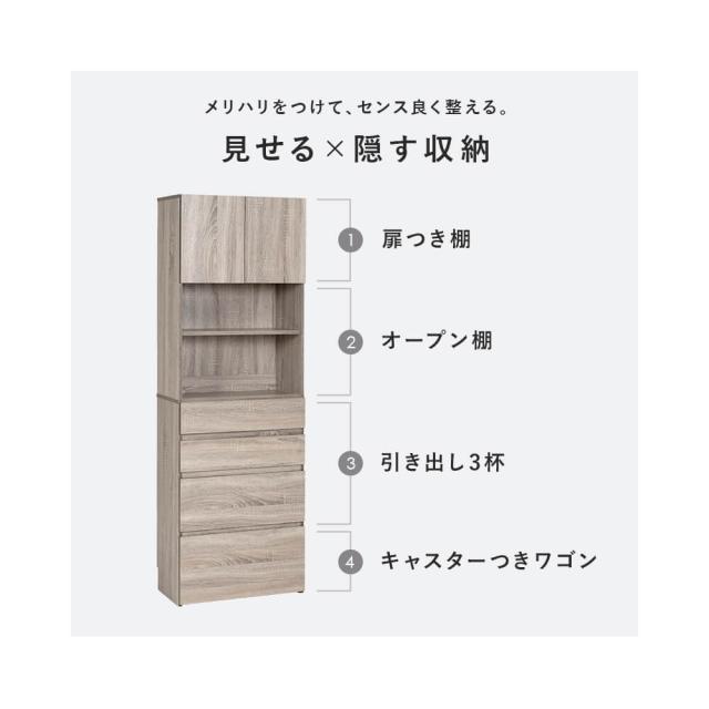 扉付き棚、オープン棚、引出し、キャスター付きワゴンと